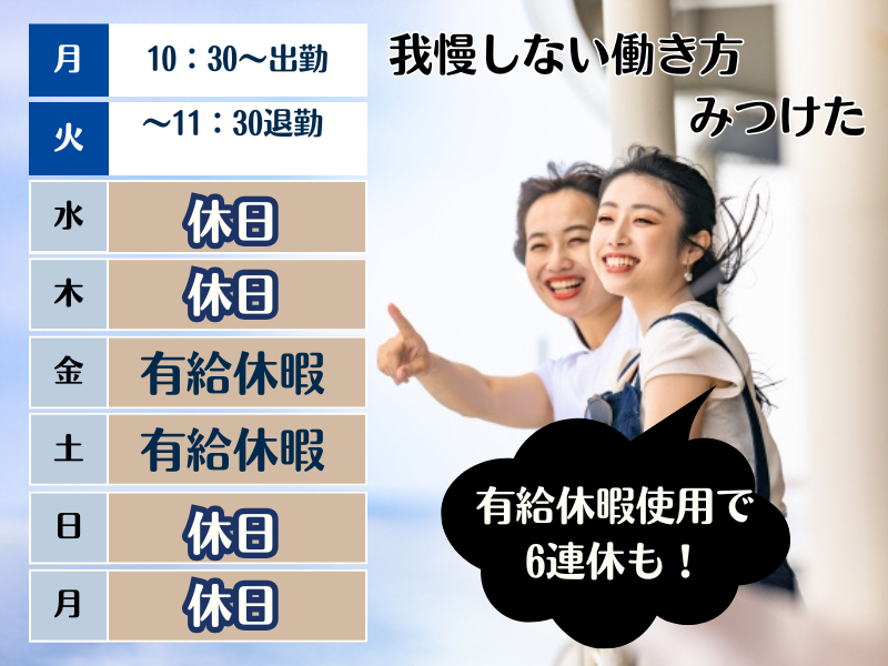 固定時間制 勤務時間詳細 総労働時間:1ヶ月あたり138時間15分 〜 158時間 10:30~翌11:30(実働時間19時間45分) (休憩5時間15分あり ▶仮眠3時間、1時間×2回=2時間、朝15分×1回) 実働は1回約20時間ですが、休憩・仮眠はしっかり5時間以上。 勤務は週2回なので、1週間のほとんどが“お休み”! まとまった自由時間がたっぷりとれる、 「メリハリある働き方」ができます。 ~1日の流れの一例~ 10:30:出勤・制服に着替える 11:00:朝礼・引継ぎ・予約数の確認など 15:00:チェックイン対応・フロント対応 24:00:仮眠(3時間仮眠+2時間15分休憩) 8:30:チェックアウト対応・引継ぎ 11:30:退勤
