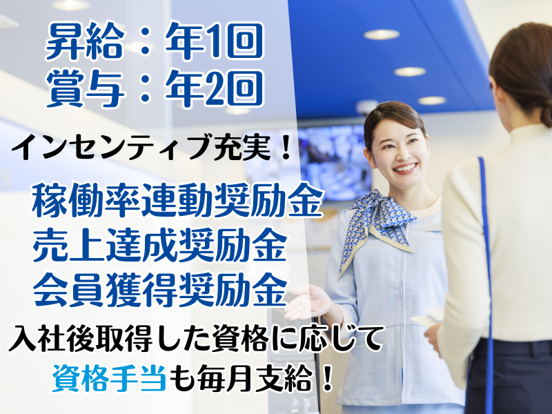 【保険制度】 雇用保険、労災保険、健康保険、厚生年金 待遇・福利厚生 【福利厚生】 ・昇給年1回 ・賞与年2回 ・交通費支給(月上限5万円) <各インセンティブあり♪> ・稼働率に応じたインセンティブ(5,000円~1万円/月) ・売上達成奨励金 ・会員獲得手当 ・深夜手当 ・資格手当※入社後の取得に限る(月1,000~5,000円) ・社会保険完備 ・制服貸与 ・有給休暇(入社6ヶ月後付与) <充実のキャリアアップ制度> ・資格取得支援(英検・簿記・パソコン検定・秘書検定) ・チャレンジ制度 └支配人や本社部門へのキャリアアップも目指せます <福利厚生充実◎> ・社員宿泊割引制度 └全国の東横イン宿泊30%OFF/本人、20%OFF/家族・知人 ・従業員割引/ベネフィット・ステーション →弊社と提携している会員制で、 お得な待遇が受けられるサービス。 約14000施設の宿泊施設に 会員価格でお得に利用ができたり、 その他にも・・・ ✅スポーツクラブ ✅介護・育児 ✅健康管理 ✅研修講座 ✅エンターテイメント ✅物販 etc 6000以上の様々なライフサービスを 揃えています。 これらすべてのメニューを 会員特別価格で 利用することができるサービスです♪ <その他> ■研修制度あり ■退職金制度(勤続3年以上)