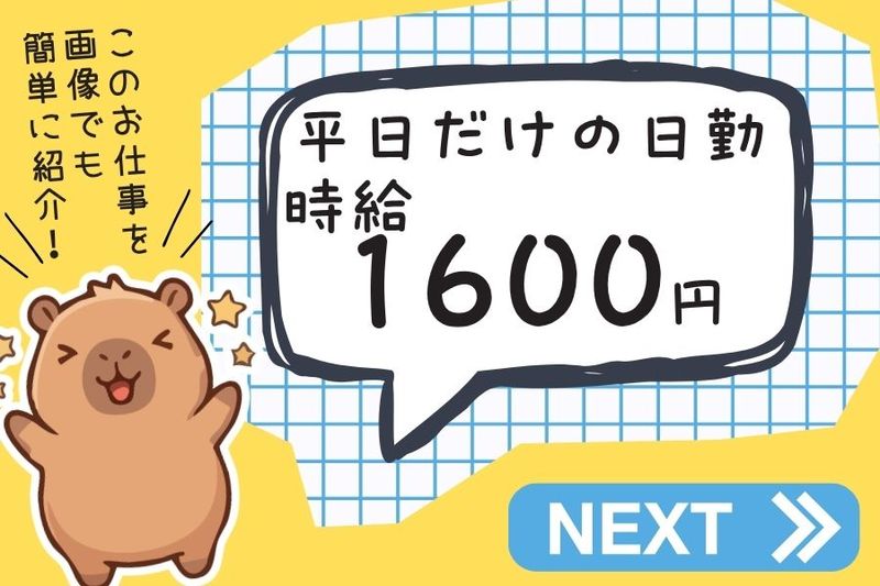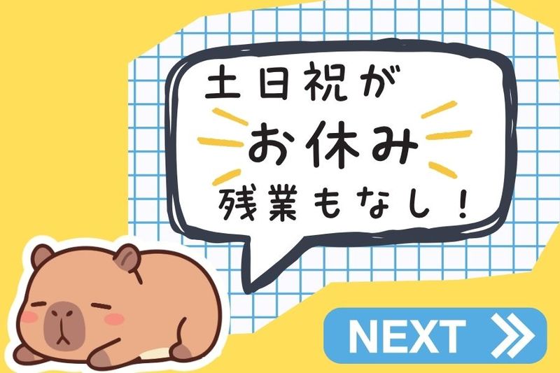 勤務時間・曜日: 【日勤のみ】 平日:8:30~17:30 休憩:計1時間 残業:なしOK※ご希望お伝えください!