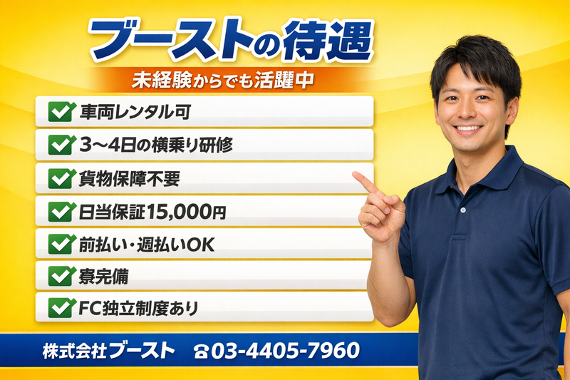 アピールポイント: 【ブースト vs 他の仕事 徹底比較】 ✅ ブースト(家具配送) 月収:50〜90万円 安定性:◎ 大手直案件で年間安定 車両:レンタル可 体制:チーム(2人1組) 研修:3〜4日横乗り 保険:貨物保障不要 将来:FC独立可能 日当保証:15,000円 ❌ 宅配便ドライバー 月収:25〜45万円 車両:自費3〜5万円/月 体制:一人で数百個 研修:なし〜1日 保険:月1〜2万円必要 ❌ 引越しスタッフ 月収:20〜50万円(波あり) 安定性:△ 季節変動が大きい ❌ 建設作業員 月収:25〜40万円 体力:重労働 / 天候:雨で収入減 ❌ 飲食店スタッフ 月収:18〜30万円 / 拘束時間:長い ❌ Uber Eats等 月収:15〜30万円 / 安定性:× 不安定 …もう、比較するまでもないですよね? LINE応募はこちら → https://line.me/R/ti/p/@228qdmhm こんな悩み、抱えていませんか? パターン①:体力が余っている人 「毎日デスクワーク。体がなまってしょうがない。」「ジムに金払うくらいなら、体を動かして稼ぎたい。」 → 家具配送なら、体を動かしながら月収90万円。 パターン②:今の収入に限界を感じている人 「手取り25万円。ここから上がる気がしない。」「残業しないと生活できない。でも体が持たない。」 → 完全出来高制だから、頑張った分だけ収入に直結。閑散期でも50万円以上。繁忙期なら90万円。 パターン③:人間関係に疲れた人 「上司のパワハラ、もう限界。」「職場の陰口、派閥争い…」 → 家具配送は、チームの相棒と二人三脚。余計な人間関係ゼロ。 パターン④:一人作業が不安な人 「軽貨物に興味はあるけど、一人で全部やるのは怖い。」 → 必ずチーム体制。先輩が隣にいるから、不安ゼロ。 パターン⑤:使い捨てにされた経験がある人 「前の会社、研修もなくいきなり現場に出された。」 → 車両レンタル可、貨物保障不要、3〜4日の横乗り研修あり。 【業種別・こんな方が活躍しています】 建設業・現場作業員の方 → 体力がそのまま武器。日当は建設現場より高い。 倉庫作業員の方 → 荷物の扱い方を知っているあなたは即戦力。 引越しスタッフの方 → 家具を運ぶスキルがそのまま活かせる。年間通して安定。 タクシードライバーの方 → 運転スキルと土地勘は最強の武器。待ち時間ゼロ。 飲食業の方 → 飲食で鍛えた体力で即活躍。圧倒的に高い日当。 ギグワーカーの方 → 「自由だけど稼げない」を卒業。単価が桁違い。 【研修サポート】 研修期間:3〜4日間(横乗り研修) 研修1日目:先輩のトラックに同乗。見て覚える。 研修2日目:先輩のサポートをしながら実際に運んでみる。 研修3〜4日目:先輩の見守りのもと、メインで動く。 卒業後もチーム配送だから、いきなり一人になることはありません。 【月収の目安】 閑散期:50万円以上 通常期:50〜70万円 繁忙期:70〜90万円 MAX実績:90万円 閑散期でも、50万円以上。普通の会社員の月収を、一番ヒマな時期でも超えてくる。これが大手家具メーカー案件の安定感です。~こんな《出口のない絶望》、いつまで続けますか?~ 「毎日、残業、残業、また残業…。なのに通帳の数字は増えず、溜まるのは疲労とストレスだけ。肩も腰もバキバキで、最近じゃ背中の鈍痛が親友だ。去年より確実に増えたのは、給料じゃなくて、医者の出す薬の種類…」 「職場の陰湿な人間関係に、心はもう限界寸前。気づけば枕に抜け毛がびっしり…。家族と笑い合う時間なんて、どこにもない。ただただ暗い部屋で、『この先どうなるんだろう…』と、出口の見えないトンネルを永遠に彷徨っているような毎日…」 「愛する我が子のために、必死で働いているはずなのに…。現実は、睡眠不足で常にイライラ。貯金通帳はいつも空っぽで、ストレスだけが雪だるま式に膨れ上がる。そして、一番大切にしたいはずの子供に、キツく当たってしまう自己嫌悪の無限ループ…。夜明けの光が、ただただ憎い…」 「親の介護と仕事の両立で、心身ともに疲弊しきっている。特別なスキルもないまま歳だけを重ね、鏡に映る自分の首のシワが、まるで人生の年輪のように刻まれていく。『もし、私が倒れたら…』その恐怖から目を逸らし、ただ息を潜めて今日をやり過ごすだけの日々…」 「まるでルーティンワークをこなすロボットのような毎日。成長なんて言葉は、辞書から消えてしまった。唯一の慰めは、夜中に現実逃避で没頭するスマホゲームだけ。気づけば朝チュン、そしてまた同じ一日が始まる。このまま誰にも必要とされず、孤独に朽ちていくのだろうか…? 俺の、私の、夢って、一体なんだったんだろう…?」 …もし、一つでも胸に突き刺さる言葉があったなら… もう、大丈夫です。あなたは一人じゃありません。 その深い絶望、その言葉にならない苦しみ、私たちブーストがすべて、根こそぎ解決します! なぜなら、上記のようなドン底の悩みから這い上がり、今や月収100万円を笑顔で稼ぎ出し、当社を力強く牽引しているのが、あなたと同じように苦しんでいた先輩ドライバーたちだからです。 ブーストのドライバーという仕事は、ただ稼げるだけで