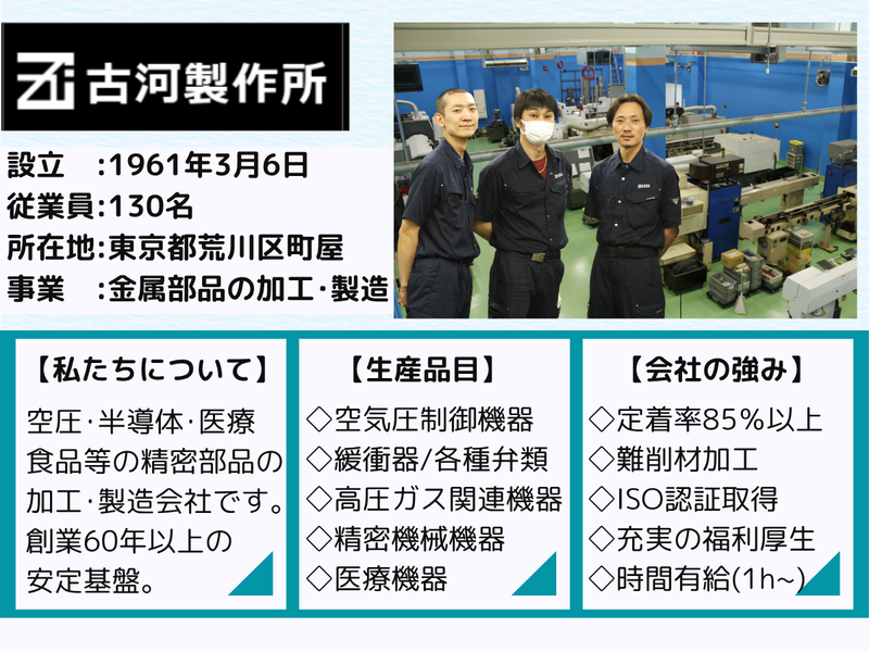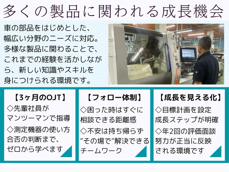 仕事内容 ✅【求人のポイント】 ――――――――――――――――――― ♦ 未経験歓迎/知識ゼロから始められる製造オペレーター! ♦ 3ヶ月の研修でイチから丁寧に育成◎ ♦ 残業ほぼなし(年間約9時間)→ほぼ毎日定時退社 ♦ 年間休日120日以上+有休で125日も可! ♦ 定着率85%以上 → 長く働ける安心環境 ♦ 昇給・賞与・家族手当など待遇充実! ♦ 創業65年以上の安定企業で将来も安心 ✅【仕事内容/製造オペレーター】 ――――――――――――――――――― 最初は「材料をセット → ボタンを押すだけ」! NC旋盤やマシニングセンタと呼ばれる、 ”材料を削って形をつくる機械”を使って 金属部品を製造する”ものづくり”のお仕事です。 <主な製造品> ・医療機器に使われる精密部品 ・食品工場の機械部品 ・自動車関連の部品 ・半導体装置に使われる部品 など 普段は目にすることは少ないですが、 社会を支える大切な部品をつくる仕事で、 自分の仕事が世の中に役立っている実感を得られます。 ✅【具体的な仕事内容】 ――――――――――――――――――― \マニュアル&先輩サポートあり/ <入社直後の業務> ・金属材料を機械にセット ・ボタンを押して加工スタート ・完成した製品の取り出し ・サイズやキズのチェック ・製品を数えて箱(バケット)へ ・台車での運搬や片付け <慣れてきたら(ステップアップ)> ・機械の刃物交換、サイズの微調整 ・数値の調整(NC補正) ・材料の準備・発注 ・図面を見ながらのプログラム入力 <将来的には> ・機械の設定やプログラムの最適化 ・より精度の高い加工技術の習得 ✅【当社の特徴/技術も家庭も両立】 ――――――――――――――――――― ✨ 未経験から“高精度加工”に携われる ┗現在活躍している社員の多くが未経験スタート! 専門技術をゼロから習得できる ✨ 多品種×小ロットで飽きないものづくり ┗毎日違う部品に関われる ✨ “考える加工”でスキルアップ ┗工夫や改善にもチャレンジ可能 ✨ 未経験入社が多く、育成前提の環境 ┗3ヶ月の研修+現場サポートで安心 ✨ 働きやすさも抜群 ・残業ほぼなし(年間約9時間) ・年間休日120日以上 ・空調完備の快適な工場 ✅【研修について】 ――――――――――――――――――― 入社後はOJT研修を中心に、 実際の現場で仕事を覚えていきます。 【STEP1:基礎研修(入社~2週間)】 ・工場内のルールや安全教育 ・工具の名前や使い方の基礎 ・測定器(ノギスなど)の使い方 ・簡単な作業(部品のセット・取り出し) →まずは「現場に慣れること」からスタート 【STEP2:実務スタート(2週間~1ヶ月)】 ・機械に部品をセット ・ボタン操作での加工 ・完成品のチェック(キズ・サイズ確認) →先輩が隣についてサポートするので安心 【STEP3:スキル習得(1~3ヶ月)】 ・機械の簡単な調整 ・工具の交換方法 ・加工精度の合わせ方(微調整) →研修後もしっかりバックアップ! ✅キャリアプラン ――――――――――――――――――― 【1年目】機械操作や検査業務を習得 【3年目】プログラム作成や工程管理に挑戦 【5年目】リーダーとして活躍 未経験→技術者→管理職も目指せる環境です ✅当社について ――――――――――――――――――― 創業65年以上の精密部品メーカー。 さまざまな業界のモノづくりを支える部品を製造し、 安定した受注基盤を築いています。 景気に左右されにくく、長く安心して働けます また、ISO認証取得の整った環境で、 安心してスキルアップできます。 少しでも興味があれば、まずはお気軽にご応募ください。 カジュアル面談でお話だけでもOKです!