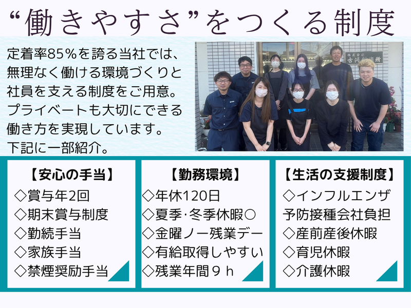 職場環境 部署の垣根を越えて社員同士の仲が良く、 上司との距離も近い為、自分の意見が 発信しやすい職場環境です。 残業も少なく、有給も取得しやすいので ワークライフバランス抜群の環境です! 急なお休みにも対応してくれるので 子育て中の方にも優しい会社です。 喫煙所:喫煙所あり(屋外) 専用喫煙スペース有り 休憩時間のみ、所定箇所にて喫煙可能