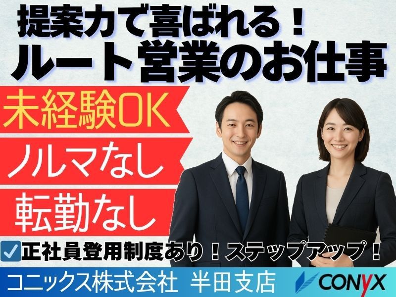 【仕事内容】 ⭕未経験OK/転勤なし/飛び込み営業なし \長く安心して働ける環境!/ コニックス株式会社 半田支店にて、既存のお客様をサポートする営業スタッフを募集! 【具体的には…】 ✅スケジュール調整 ✅スタッフの管理(シフト・採用面接) ✅簡単な資料や見積書作成(フォーマットあり) ✅清掃箇所の追加や設備メンテナンスの提案 ノルマや飛び込みではなく、「現場のスタッフが働きやすい環境づくり」や 「建物管理の改善提案」など、関係性を深める営業スタイルです! 【未経験安心ポイント】 ・研修で丁寧にレクチャー ・まずは小規模現場からスタート ・管理職デビューも可能! 【キャリアアップ】 ・正社員登用制度あり ・資格取得も会社が応援! 「人とコミュニケーションを取るのが好き」 「地域で安定して働きたい」 そんな方、大歓迎です! まずはお気軽にエントリーください! 【求人ID-AZR08A】