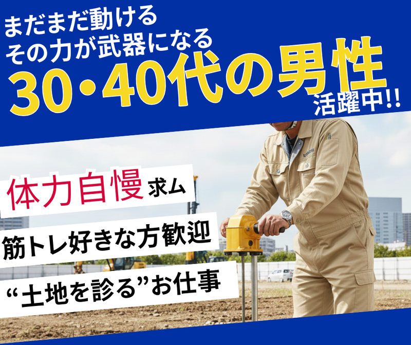 求めている人材 ■未経験者歓迎 ⇒9割が未経験スタート!業界未経験歓迎! ■経験者歓迎! ■安定して働きたい・稼ぎたい方歓迎! ■副業・WワークOK ■フリーター歓迎 ■経験者歓迎!ブランクOK! ■20代活躍中、30代活躍中、40代活躍中 【こんな方も大歓迎です!】 ・地盤調査や測量の経験を活かしたい方 ・現場仕事デビューの方 ・社会人デビューの方 ・インフラに関わる仕事がしたい方 ・休みよりも給料重視! とにかく稼ぎたいという方 ・長く安定して働きたい方 ・すぐ働きたい方 ・旅行が好きな方 ・色々な場所で働きたい方 ・ご当地グルメや地酒が好きな方 正社員・契約社員・アルバイト・パートなど 雇用形態に関係なく、地盤調査や測量経験 がある方は大歓迎です。 地盤調査・土地調査・測量機器の操作経験、 測量士・測量士補の資格をお持ちの方は優遇! 地盤調査・測量の仕事は、街づくりやインフラ整備 に欠かせない重要な業務です。 スキルや経験を活かしたい方、 興味がある方も大歓迎です!
