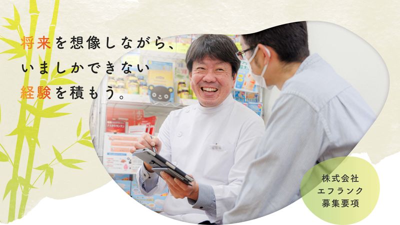 仕事内容 ─┘─┘─┘─┘─┘─┘─┘─┘ 自分らしく、 着実に成長していこう。 薬剤師 募集 ─┘─┘─┘─┘─┘─┘─┘─┘ 【当社のポイント】 ★いままでの経験が活きる! ★給与にもこだわれます ★お休みも充実◎ —- 株式会社エフランク —- 大阪市にある、 「たけのこ薬局 野江店」を運営する会社です。 近隣の内科・皮膚科・整形外科など、 120〜140の医療機関の処方箋調剤をおもに手がけています。 —- 仕事内容について —- 処方箋調剤中心に、 〔薬剤師〕として薬局業務全般を担当していただきます。 マネジメントをはじめ、 さまざまなスキルを習得することができます。