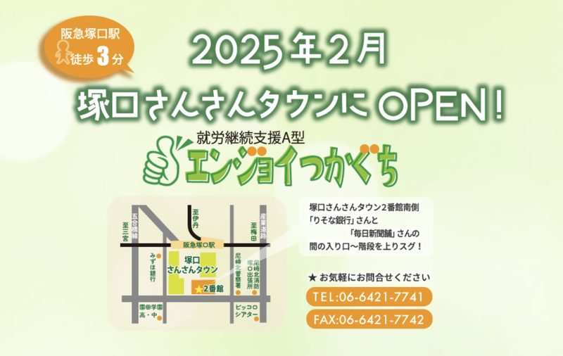 選考プロセス 応募⇨見学⇨体験⇨面談⇨採用 お電話でのご応募も受け付けております♪ 気軽にご質問ください! 【お問い合わせ先】 メール:info@enjoy-sp.com 電話番号:06-6421-7741 【面接地・登録地】 【就労継続支援A型】エンジョイつかぐち 所在地:兵庫県尼崎市南塚口町2丁目1番2号塚口さんさんタウン2番館203号室 担当者:採用担当者 電話番号:0664217741 メールアドレス:info@enjoy-sp.com