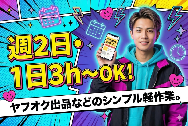 仕事内容 \ 未経験OK!シンプル軽作業 / ⭐ヤフオク出品&発送スタッフ募集⭐ コツコツ作業が好きな方歓迎! 【仕事内容】 ✔ヤフオクへの商品出品 ✔商品の梱包作業 ✔発送準備、発送対応 作業はシンプル中心。 未経験でもすぐ覚えられます♪ 【働き方】 ■週2日〜勤務OK ■1日3時間〜OK ■シフトは2週間ごと提出 授業の空き時間や Wワークにもおすすめ。 【勤務イメージ】 ▼フル勤務 9:00 出社・発送対応 10:00 出品作業 12:00 休憩 13:00 出品作業 17:00 退社 ▼短時間勤務 9:00 出社・発送対応 10:00〜13:00 出品作業 【職場について】 現在スタッフ5名 20代〜30代中心に活躍中 落ち着いた環境で 集中して作業できます。 【サポート体制】 ・作業マニュアルあり ・先輩スタッフがサポート 未経験からでも 安心してスタート可能。 【応募歓迎】 ■学生OK ■フリーター歓迎 ■副業・WワークOK 経験・資格は不要。 まずはお気軽にご応募ください!