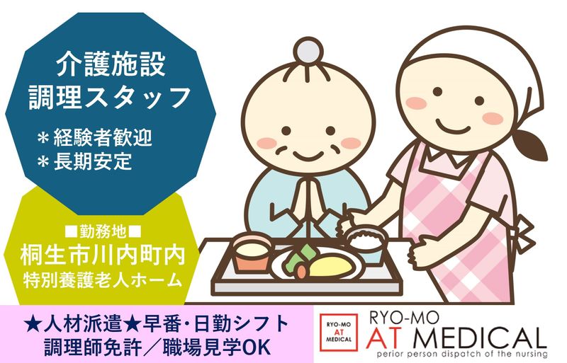 仕事内容 【人材派遣】【調理師資格】【早番・日勤シフト勤務】 【月収21.8万可】 特別養護老人ホームの調理スタッフ新規募集 群馬県桐生市の特別養護老人ホームにて、調理スタッフを募集します。 「調理師資格」を活かして働きたい方必見! <おすすめポイント> ・早番、日勤のみのシフト勤務 ・月収21.8万円可(時給1,300円~) ・残業少なめ&安定勤務 ・職場見学OK!マイカー通勤も可能 *福祉施設・介護施設での厨房経験がある方歓迎! *「長く安心して働きたい」「群馬・桐生エリアで正社員を目指したい」 方にピッタリのお仕事です。 <主な仕事内容> 施設内にて入居者様へのお食事提供に関わる 調理業務をお任せします。 ・調理、盛り付け ・配膳、下膳 ・食器や調理器具の洗浄 ・厨房内の衛生管理 など <雇用・期間> 派遣社員(即日~長期) *勤務開始日、入社日等相談OK <勤務地> 群馬県桐生市川内町1丁目内「特別養護老人ホーム」 ・JR両毛線「桐生」駅から車で15分 ・上毛電気鉄道「西桐生」駅から車で15分 *職場見学OK(事前予約要) *マイカー通勤可 *駐車場完備 <応募・サポート> この求人は 「人材派遣」 です。 地元群馬に強い医療・福祉専門人材会社 株式会社両毛アットメディカル が、 ご相談~面接~入社~フォローまでフルサポートいたします。 【検索キーワード】 調理師/調理スタッフ/厨房スタッフ/給食調理/人材派遣/正社員登用あり/特別養護老人ホーム/介護施設 調理/福祉施設 調理/群馬県 桐生市/桐生市 調理師/日勤のみ/早番あり/残業少なめ
