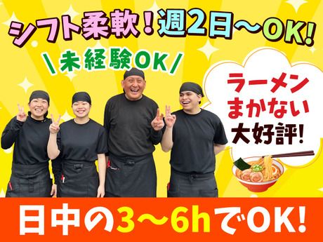 仕事内容 <ラーメン山岡家で接客・調理をお願いいたします!> ・ホールでの接客 ・キッチンでの仕込みやスープ作りなど調理 食券制なので難しいレジ業務はありません! 最初は食券を預かる業務や野菜を切る業務など、 基本的な業務から始めていただきます。 入社後は接客・調理のイロハから学ぶので 「初めてで心配…」という方も安心です◎ <9~18時フルタイムでしっかり稼ぐ!> 【月収例】 ★1日8時間、週3日の場合 ⇒1400円×8h×12日=13万4400円 ★1日8時間、週4日の場合 ⇒1400円×8h×16日=17万9200円 ★1日8時間、週5日の場合 ⇒1400円×8h×20日=22万4000円 <20代・30代・40代の方活躍中!> 9-18時・朝~夕方迄の日勤シフト フリーターさん大歓迎! Wワークも◎ 未経験の方も安心スタート 先輩スタッフが丁寧にフォロー するので初バイトでも始めやすい♪ ★こんな方にぴったり★ ・フルタイムでしっかり稼ぎたい ・夕方、夜の時間は自由に過ごしたい ・夜からのWワークと両立したい ・ラーメンを食べながら楽しく働きたい ・生活リズムを整えたい 現在活躍中のスタッフも フリーター多数! 昼間の時間に 自分のペースで無理なく 働けるお仕事です。 少しでも気になった方 ぜひお気軽にご応募ください♪ <まかないあり!> 山岡家のラーメンは、 創業者・山岡正が追い求めた味を 全店舗で受け継ぐ、 こだわりの濃厚豚骨ラーメン。 厳選した豚骨を丸4日間煮込んだ、 コクと甘みのあるスープが自慢です。 そんな本格ラーメンをまかないで 味わえるのが山岡家の魅力。 24時間営業の店舗が多く、 深夜や長時間勤務後でも温かい一杯で しっかりエネルギー補給できます。 食費を抑えたいフリーターさん、 Wワーカーさんにも好評です。