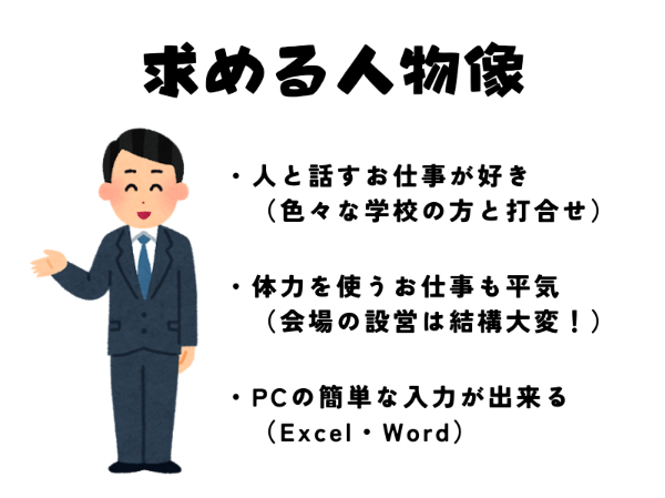土日祝日お休み!未経験の方大歓迎!高校生の進学イベントに関する高校・専門学校へのルート営業 進学イベントに関する学校へのルート営業 北海道札幌市白石区本郷通8丁目北8-17本商ビル302 派遣社員 求人の特徴 オンコールなし 原則定時退社 固定シフト制 土日祝休み 夜勤なし 完全週休二日制 平日のみ OK 年間休日 120 日以上 残業ほぼなし 深夜勤務なし 大卒 専門卒 短大卒 高卒・高認合格 高専卒 オフィス PC 貸与 ゴールデンウィーク休暇あり ストレスチェック 交通費支給 冬季休暇あり 夏季休暇あり 年末年始休暇あり 有給休暇あり 連続休暇取得可能 長期休暇あり 40 代も応募可 U・I ターン歓迎 バイトデビュー歓迎 ブランク OK フリーター歓迎 主婦・主夫歓迎 学歴不問 新卒歓迎 未経験者歓迎 業界未経験者歓迎 第二新卒歓迎 経験浅め歓迎 高卒歓迎 リモート面接 OK 勤務開始時期調整 即日勤務 OK 職場見学可 電話で応募・問い合わせ 面接 1 回 転職回数不問 クールビズ OK 駅近 5 分以内 残業手当あり 業務内容 未経験の方大歓迎! 高校生のみなさんの明るい未来のために力をお貸しください! ━━おすすめポイント━━ ◎土日祝日お休み ◎駅から徒歩で5分 ◎有給を取得しやすい ◎学歴・経験不問 ◎正社員登用あり ◎事前に職場見学ができるので安心♪ 【仕事内容】 高校生の進学イベント(大学・専門学校)に関するルート営業のお仕事です♪ 【具体的なお仕事内容】 ・高校や専門学校の先生との連絡 ・データ入力 ・書類作成 ・イベントに必要な機材の準備 ・学生さんへの配布資料の準備 ・イベントの運営(現地での会場設営や先生の案内・学生さんの誘導・各種学校のお手伝い) などのお仕事をお願いいたします。 ※イベントの会場設営はとても体力を使います! ※8:00~17:00勤務の募集です。 ※道内の遠方で開催されるイベントへの出張もあります。 【先輩の声(1)】 自分の母校とお仕事できるところが、初めは恥ずかしかったのですが、今ではやりがいを感じてます。 【先輩の声(2)】 イベントの度に高校生のみなさんの明るいエネルギーを感じで元気になります。 ※当社が雇用する派遣スタッフとして派遣先で勤務いただきます 職種 進学イベントに関する学校へのルート営業 雇用形態 派遣社員 勤務体系 固定時間制 リモートワーク制度 リモートワークなし 勤務先事業内容 労働者派遣事業・有料職業紹介事業・登録支援機関