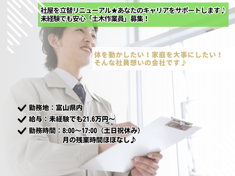 仕事内容 ⭐未経験から年収UP!⭐ 地図に残る仕事に挑戦しませんか? ・■・■・■・■・■・■・■・■・■・ \\ この求人のポイント // ⭐未経験大歓迎!学歴不問です! ⭐資格取得を全面支援! ⭐残業ほぼなし!年休113日! ⭐有給取得推進!働きやすさ改善! 月1以上やすべて使う社員もいます! ・■・■・■・■・■・■・■・■・■・ ――――――――――――――――――― ✅ 今回募集する仕事は…  ̄ ̄V ̄ ̄ ̄ ̄ ̄ ̄ ̄ ̄ ̄ ̄ ̄ ̄ ̄ ̄ ̄ ̄ \あなたの仕事が「富山の未来」になる/ 富山県内の現場で、地域インフラを支える 土木工事全般をお任せします。 私たちが手掛けるのは、生活に欠かせない 道路や下水道などの「カタチに残る」仕事。 自分の仕事が地図に残る 「達成感と誇り」を感じられます。 ――――――――――――――――――― ✅ 具体的な仕事内容は…  ̄ ̄V ̄ ̄ ̄ ̄ ̄ ̄ ̄ ̄ ̄ ̄ ̄ ̄ ̄ ̄ ̄ ̄ ■土工事 └ショベルカー等で地面を掘り、 構造物の頑丈な土台を築きます。 全ての工事の基礎となる重要な工程です。 ■排水工事 └大雨による浸水を防ぐための排水管を 設置し、側溝を作ります。 ■公共下水道 └生活排水を処理場へ送る下水道管を 設置します。 ⭐現場までは社用車で向かいます! ⭐会社へは17時過ぎに戻って来れるので 残業の心配もありません! ⏩未経験OK! ………………… 経験豊富な先輩社員が丁寧に 指導しますので未経験からでも 安心して始められます。 最初の3ヶ月間は先輩社員と行動を共にし、 基本的な作業方法や安全管理について 学んでいただきます。 その後も段階的に技術を習得できるよう、 一人ひとりのペースに合わせた指導を 心がけています。 ⏩資格取得支援サポート ……………………………… 当社では社員のスキルアップを 積極的にサポートしています。 資格取得のための試験受講費用は 初回全額負担! 挑戦する機会を大切にしています。 資格を取得することで給与査定にも 反映されるため、技術と収入の両面で キャリアアップが可能です。 ⏩やりがい ……………… 自分たちが手がけた工事が形として残り、 地域の安全や暮らしを支える 基盤となります。 「自分の仕事が地図に残る」という達成感と 誇りを持って働くことができます。