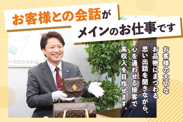 仕事内容 \今の給料で満足?/ …━━━━━━━━━━━… 「給料低いけど、まぁこんなもんか…」 とか思ってませんか? ここで働くスタッフの財布は、あなたの想像より遥かにパンパンです。 ⏩平均年収1,200万円以上! (うちのスタッフ、たぶん前世で徳積んでる) ⏩年収2,000万円超え の猛者も在籍中! ⏩20代で月収200万円 も夢じゃない!「稼ぐ」って楽しい! ⏩年2回のボーナスが100万円超えの社員が7割!(前年度実績) 「自分の成果=給料」 の図式が完璧に成立。 ガッツリ稼いで、人生の難易度を下げる準備をしませんか? ━━━━━━━ お仕事内容 ━━━━━━━ ブランド品や貴金属を「これはいくら?」と査定しに来たお客様の接客がメイン。 でも大丈夫!専門知識は一切不要。 ①お客様が来店。「これ売りに来たんだけど」 ②持ち込み品を拝見。 ③スマホで撮影&情報入力!本部へ送信。 ④本部から金額が返ってくる。 ⑤お客様へ買取金額を提示。 丁寧な接客ができれば問題なし。 1日4~5人の接客だから、変に疲れることもありません。 買取業務以外では、パソコンのデータ入力やバイヤーさんと連絡を取り合うことも。 ━━━━━━━━━━━━━━━ ✨ここが最高のポイント! ━━━━━━━━━━━━━━━ ✅未経験者、大歓迎!知識ゼロからスタートがほとんど! ✅体力仕事ゼロ! 重いもの運んだり、汗だくになる仕事とは無縁のストレスフリーな職場。 ✅ノルマは無し! 稼ぎたいなら勝手に頑張っちゃう環境です。 ✅入社祝い金50万円! (詳細条件あり。) \いわゆる体育会系…ではありません!/ …━━━━━━━━━━━━━━━━━━━… スタッフの8割が20代~30代! 男性:女性=6:4 社員同士の交流もあり、仲の良さが自慢! また、体育会系な雰囲気はまったく無いのも、居心地の良い理由のひとつです。 ◎中途採用100%! ほとんどの人が「もっと稼ぎたい」と転職してきました。 ◎社員旅行や飲み会 もあって、仲の良さには自信あり!仕事も遊びも全力投球! ◎店舗は1~2名体制。自分のペースで仕事に取り組めます。 「前の仕事は頑張っても給料が上がらない…」 …━━━━━━━━━━━━━━━━━━━… ⇒大丈夫、ここではあなたの成果が給与明細をブチ破ります。 未経験から入った先輩が、イチからしっかりとレクチャーします。 先輩社員と一緒に業務を行いながら、ご自身のペースで仕事に慣れていけますよ。 着実に高収入プレイヤーへと成長できる環境です。 安心して飛び込んできてくださいね! その他に… …━━━━━… ⏩在職中でもOK!入社日も調節できます。 ⏩有給もとーっても取りやすい!