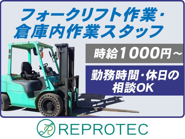 仕事内容 群馬県前橋市市之関町にある リプロテック市之関工場での 倉庫内作業・フォークリフト作業スタッフ (パート・アルバイト)の求人募集です。 https://reprotec.co.jp/recruit/ \ このお仕事の魅力! / ・昇給あり/年功序列ではない評価制度あり ・週1からOK ・勤務時間の相談OK(例:8時から17時まで) ・勤務時間4時間からOK ・休日の相談OK ・交通費支給 ・社員登用制度あり ・未経験者でもOK ・面接1回 《 募集職種 》 倉庫内作業・フォークリフト作業スタッフ (パートアルバイト) 《 お仕事内容 》 フォークリフト作業が中心で 食品リサイクルで製造した飼料をトラックへの積み込み また、入荷した原料の倉庫への入庫作業をお願いします。 パレット積みやフレコンバッグの荷物が主です。 《 未経験OK/経験のある方歓迎 》 当社スタッフ(正社員)が 常駐していますので 初めてという方でもご安心ください。 詳しい作業工程等の他 業務に関する色々な質問や相談は いつでもお応えできる環境を 整えています。 《 こんな職場です! 》 40代正社員スタッフの他 パート・アルバイトのスタッフ3名在籍し 日々、協力して作業しています。 「おたがい様」の気持ちを 持っているスタッフばかりだから、 お互いフォローし合い、急なお休みも 無理なく対応できる風土が当社にはあります。 《 当社社風について 》 当社社長は 「しっかりと休みを取り 残業しないで働けるのが一番!」 という考えを持ち実践してくれています。 そんな会社だから、 「居心地が良い会社」 そんな風に感じているスタッフが たくさんいるんです。