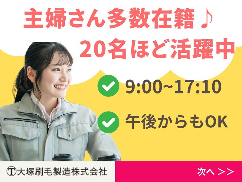 職場環境 *30~50代の主婦さんが 20名ほど活躍中です。 *平日のみ! 勤務時間も相談OKです。 *食堂あり! お弁当を持参して食べたり、 近くのスーパーやお弁当屋さんで 購入もOK! 近場の人は自宅に帰って お昼や家事を済ませる方も! 喫煙所:喫煙所あり(屋内)