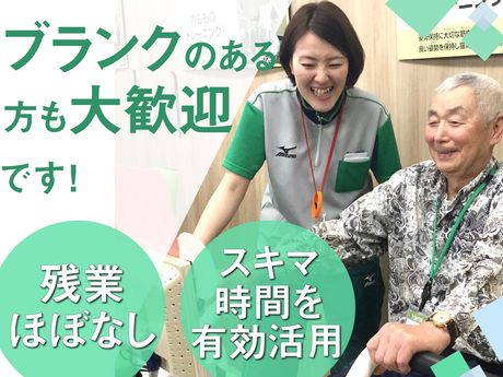 職場環境 【従業員構成】 施設には20代から40代の介護スタッフさんや50代・60代のドライバーさんなど、 幅広い年代の方々が活躍されています。 介護予防運動専門というデイサービスは、介護業界のなかでも新しいスタイルです! 若手スタッフたちが中心となり、このサービスを開拓&ご提供しています。 ご利用者様が前向きにケアやリハビリに取り組めるようにスタッフ全員で意見を出し合い協力し、 明るく笑いの絶えない空間づくりを実現しています。 【職場の雰囲気】 落ち着いた職場 協調性がある アットホーム 初心者活躍中 力仕事が少ない 自分の都合に合わせやすい