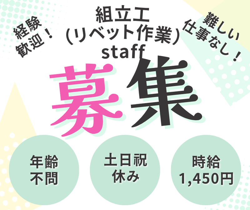 時給1,450円以上 給与詳細 基本給:時給 1450円 〜 ※スキルや経験を考慮します 【給与例】 給与例 時給1450円の場合×7時間45分×22日=月収24万7225円 長期休暇を利用して旅行に行きたい!という方や プライベートを大切にしたい方にもピッタリ! 「事務職など座り仕事しかしたことがない」「立ちっぱなしの仕事が心配・・・」 という方も心配いりません! 部品はどれも軽量。 重い物もなく身体への負担も少なめ!