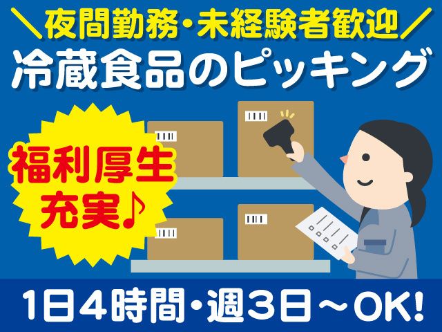 夜間の冷蔵食品ピッキング作業! 1日4時間~、週3日~勤務相談OK! 未経験者大歓迎です!