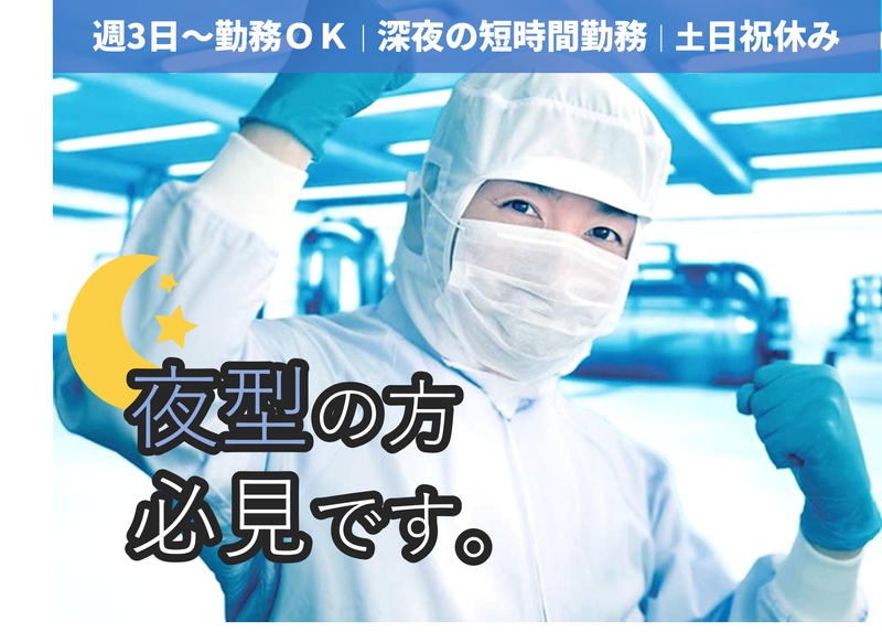 勤務時間詳細 22:30~翌2:30(実働3.5~4h) ★深夜の短時間勤務 ※週3日~勤務OK!