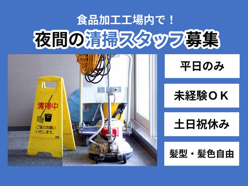 仕事内容 【新着】平日のみ! 食品加工工場内でのオシゴト♪ <業務内容> ■生産作業後の工場内清掃 ■機械洗浄業務 ■高圧洗浄機を使用して作業 などをお願いします! 先輩スタッフの丁寧な指導あり! カンタンな作業なのでもくもくと働けます☆ 清掃未経験の方も安心してスタート出来ますよ◎