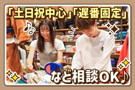 勤務時間 09:30~20:15 ★週3~6日、1日6~8時間で相談OK ★週2回以上、遅番(閉店まで)の勤務必須 ★月に数回以上、土日祝の勤務必須 - 【働き方は柔軟に対応します】 ・土日祝中心 ・レギュラー勤務 ・遅番固定で