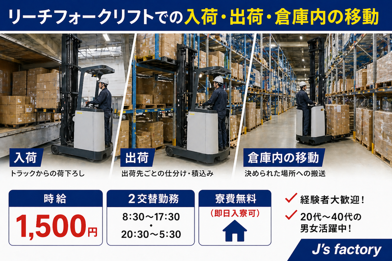 仕事内容: ■仕事内容 倉庫内での入出荷作業を担当していただきます。 リーチフォークリフトを使用した運搬がメインの業務です。 「フォークにしっかり乗りたい方」に向いている環境です。 ■具体的な作業内容 ・リーチフォークリフトでの商品の運搬 ・入荷された製品の荷受け・指定場所への格納 ・出荷指示に基づいたピッキング・搬送 ・パレットの移動や整理整頓 ■作業の特徴 ・フォークリフト乗車が中心の業務 ・構内作業のみで長距離運転なし ・決められたルートでの運搬作業 ・動線が整備されており作業しやすい環境 ■ポイント ・リーチフォークの経験をしっかり活かせる ・フォーク作業に集中できる職場 ・体への負担も比較的少なめ ・コツコツ・もくもく作業