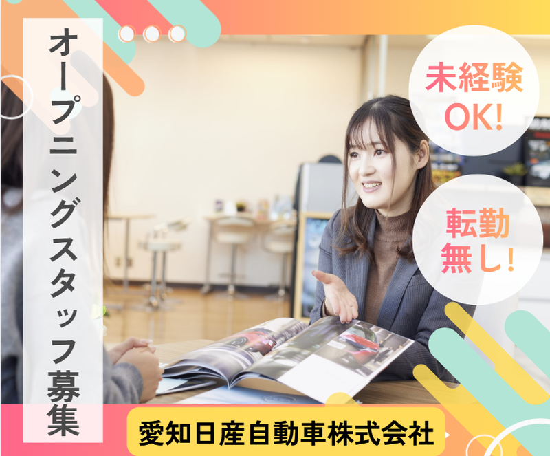 仕事内容 初!常滑イオンに中古車店オープン! オープニングスタッフの募集です! ━━━━━━━━━━━━━━━━━ ✅未経験OK!クルマ知識不要! ✅飛び込みや無理な売込み営業は無し! ✅賞与年2回!昇給年1回! ✅県外への転勤無し! ✅従業員約1500名規模の安定企業! ━━━━━━━━━━━━━━━━━ 仕事内容(来店対応型の営業) ━━━━━━━━━━━━━━━━━ 地域に根差し、お客様ひとり一人 ご家族の方々の「生活」を 支えるお仕事です。 県外への転勤はなく、 地域密着型で長く働ける環境♪ はじめは先輩に同席し お客様との関り方、ご案内内容や ご購入後の業務などを 覚えていただきます。 マニュアルもあり! 未経験スタートで活躍中の 先輩も多数在籍しています! ━━━━━━━━━━━━━━━━━ 未経験でも売りやすい! ━━━━━━━━━━━━━━━━━ 中古車販売は、新車と比べて 「この車を探していた!」 と、購入目的が明確な お客様が多いのが特徴。 ★クルマの知識に自信がない方でも 安心してスタートできます! ━━━━━━━━━━━━━━━━━ 職場環境・当社について ━━━━━━━━━━━━━━━━━ 当社は、全国的に高い知名度と 信頼を誇る日産自動車の正規販売店。 4月からは日産プリンス名古屋との 合併を予定している 従業員数約1500名規模の会社です。 イオンモール常滑の中古車店は 当社にとっても初の試み! イオンモール施設の中ではなく、 駐車場などの敷地内に お店を構えます。 7月オープン予定ですが それまでの間は近隣の店舗で 研修を受けていただきますので ご安心ください!