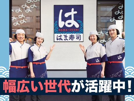 職場環境 【従業員構成】 *はま寿司には色々な働き方をしているスタッフがいます。 ・お子さんの送り迎えの合間に働きたい主婦(夫)の方 ・授業前の時間を有効活用して働く学生さん ・がっつり稼ぎたいフリーターさん など 毎日のスキマ時間でも働けるのでブランク明けで長時間勤務が不安な方や家事・育児・学校・趣味との両立したい方に好評です。 スキマバイトにもうってつけです! もちろんガッツリフルタイムで稼ぐことも出来ますよ! 【職場の雰囲気】 にぎやかな職場 協調性がある 立ち仕事 アットホーム お客様との対話は多い 長く働ける 力仕事が少ない 自分の都合に合わせやすい 知識、経験不要