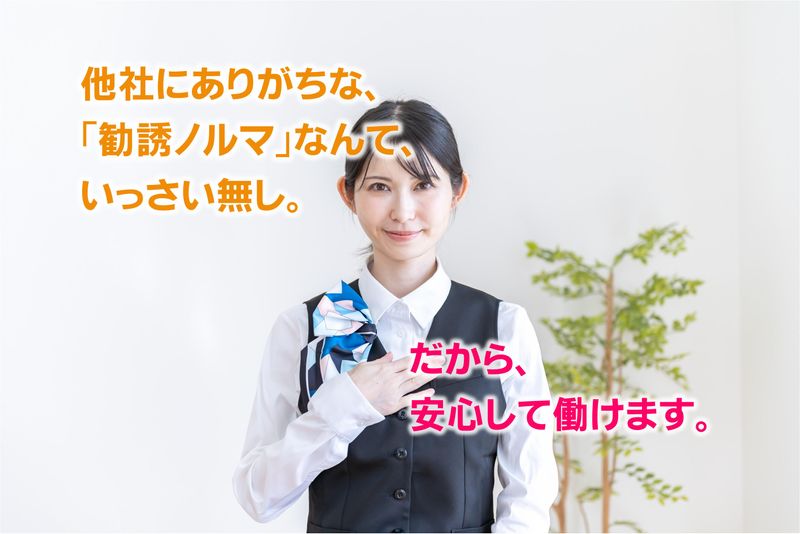 職場環境 ■男性スタッフ活躍中! 20代〜40代活躍中の和気あいあい とした雰囲気の職場です♪ お客様の心に寄り添うことはもちろん 働くスタッフに対しても家族のように 温かく接しています。 その他、斬新な取り組みが 盛りだくさんの職場です。 喫煙所:なし(敷地内全て禁煙) 基本的には敷地内は終日禁煙です。