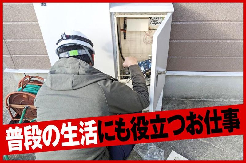 仕事内容 戸建て住宅やマンションに光ファイバーを取付ける作業です。 初めは工具の取り扱いなど補助作業からスタート! ゆくゆくは班長として現場をお任せ出来るようサポートします! 将来、独り立ちできる技術を身につけられます! 大手ケーブルTVなどの通信施工業務を手がけています。 通信事業はこれからもなくなることがないため、将来性もバツグンです! 気になったらまずはお電話を! TEL:090-1950-6338(担当:ナカガキ) ☆☆☆☆☆このお仕事、ここが魅力☆☆☆☆☆ ・平均年齢は30代です! ・給与そのままで14時などに帰宅できる日も! ・取引先は大手企業!安定感◎ ・面接1回のスピード選考 <若手社員が活躍中!> 会社設立当初から、 ”人を育てる事”を一番大切にしています。 そのため、仕事に必要なことであれば 外部講習や資格支援に対する時間は惜しみません。 素直に成長してくれる従業員が多いため、 20・30代の管理職登用実績もあります。 <働き方は選択可能!休日の日数が選べます> 当社では”無理をしない働き方”を目指しています。 それぞれの生活に合わせて勤務していただきたいので、 ①完全週休2日、②週休2日から選択できる働き方をご用意しています。 具体的には、 ①「家族との時間を大切にしたいから、 毎週必ず2日はお休みがほしい!」 など、完全週休二日制タイプ ②「週休1日のときがあってもいいから、 ガッツリ稼ぎたい!」 など、週休二日制のタイプです。 ①の働き方でスタートし、 希望があれば②の働き方にチェンジする、なんてことも可能。 お気軽にご相談ください。 <未経験の方も大歓迎!> 「経験がないから自分にできるか不安」 そんな方でも問題ありません! 仕事の流れが身に付くまでは、 先輩がマンツーマンで指導するから安心。 3ヶ月ほどの時間をかけ一人前を目指しましょう。 また、通信工事経験あれば特に優遇! お持ちのスキルを活かしてぜひ活躍してください! <以下のような場面でも役立つお仕事内容です> ・家電を買ったときに自分で配線ができる ・インターネットの快適な速度調整ができる ・新しい電気・通信関係の情報が逐一入ってくる ・配線が気にならないベストな間取りを考えられる などなど、これから家を建てたい人にはピッタリのスキルだと思います! *インボイス制度開始に伴い正社員として 働きたい方もご遠慮なく応募ください。