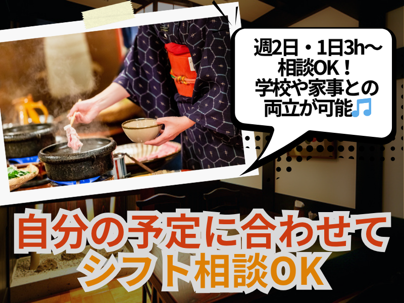 仕事内容 【✨まずは一度気軽にお話ししてみましょう!✨】 担当より24時間以内に 応募者全員に必ずご挨拶の電話をさせて頂きます! ※✅電話が繋がらない場合はSMSにて連絡します ※✅LINEでご応募いただいた方は、 LINEからご連絡させていただきます。 おいしい賄いあります! ☆ 授業後OK!18:00〜などシフト柔軟 ☆ テスト期間はシフト調整OK/週2・4h~OK ☆ 就活にも役立つ「敬語・接客・所作」が身につく ☆ 同年代の仲間も多く、大学外のつながりもできる! 仕事内容 \初バイト・飲食未経験の大学生、大歓迎!/ 広島市中心部にある高級和食店「八雲」で、 “接客マナー”と“気遣い力”が身につくお仕事です。 *具体的なお仕事 ・ お客様のお出迎え・ご案内 ・ 注文受付・料理やドリンクの提供 ・名物「すすぎ鍋(しゃぶしゃぶ)」のご案内 ・ 着物での接客(丁寧にレクチャーします!) ※最初は先輩がそばでサポートするので安心! ※着物への着替え時間も時給支給(規定あり) 働く仲間・環境 ▶︎ 広島市内の大学(広島大/修道大/安田女子大など)から通うスタッフも多数 ▶︎ 同じように「初バイト」だった先輩も活躍中! ▶︎ 「接客が好き」「人と関わる仕事に興味がある」そんな方が集まっています♪ ✅こんな方におすすめ! ・自分磨きをしたい・マナーを学びたい ・将来、接客や人と関わる仕事がしたい ・普通のバイトでは物足りない ・落ち着いた空間で働きたい ・初バイトだけど、しっかり学びながら成長したい!