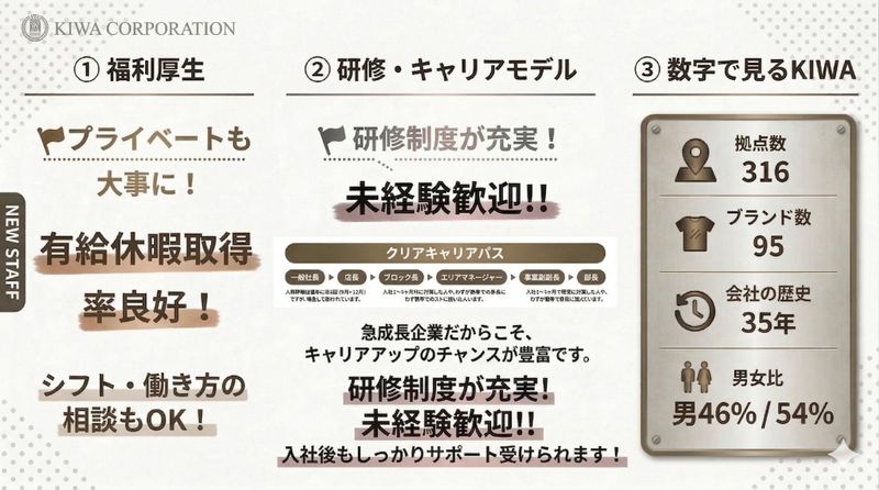 求めている人材 【こんな方をお待ちしております】 ・飲食業に興味がある方 ・料理人としての腕を磨きたい方 ・経験や技術を活かしたい方 ・将来自分のお店を持ってみたい方 ・店舗の運営や経営に関心のある方 ・安定感のある企業で働きたい方 【こんな方におすすめ】 *人と話すことが好きな方 *安定感のある企業で働きたい方 *20代~60代までの様々な年代が活躍中 *アルバイト・業務委託から正社員になりたい方も歓迎 *キッチン・ホール・洗い場・調理補助の経験はすぐに活かしていただけます! 【こんな方必見】 *カフェ・居酒屋・ファストフードなど、飲食関連のお仕事経験のある方 *飲食店でアルバイト経験のある方 *現在転職活動をしている方 *ブランクから職場復帰を考えている方