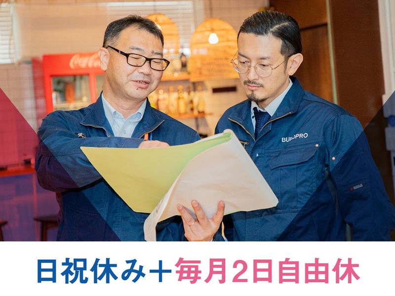 仕事内容 \午後出勤も夕方退勤も、あなたの自由/ フレックス勤務&リモートワークもOK! 500万~1億5000万規模の案件の中から やってみたい案件も担当できる、 自由度と裁量が超大きい施工管理です。 ❖初年度年収は最大800万円まで保証❖ ―・―・―・―・―・―・―・―・―・―・―・―・― 毎日厳しく管理される日々から卒業。 「今日は午後から」「明日は在宅で」などなど 自分らしく、納得いく働き方にシフト! 興味のある案件を選べる面白さも格別です。 「いつも時間に追われてばかり」 「裁量が無さすぎて疲れた」 「もっと自分らしく働ける環境ないかな」 という方は、ぜひ最後までご覧ください。 ────────────────── ……⭐今の職場と比べてください⭐…… 代表自ら、働きやすさを整えました! ────────────────── ✅フレックス勤務(コアタイム無し) ▶午後出勤や夕方退勤もOK ✅状況に応じてリモート勤務OK◎ ▶360度カメラで遠隔から現場確認できる ✅現場へは直行直帰OK ✅案件規模は500万~1億5000万まで多彩 ▶やりたい案件も、希望通り担当できる ✅初年度年収500万~800万保証 ▶昇給・賞与は案件の粗利反映 ✅日祝休み+毎月2日の自由休あり ✅見積・積算のAI自動化ツール導入中 ✅寮・社宅あり ✅お米毎月支給(社長の実家産) ✅意思決定スピードが早くストレスなし ┏━━━━━━━━━━━━━━━━┓ ❖株式会社ビルドプロってこんな会社 ┗━━━━━━━━━━━━━━━━┛ 創業は2011年。リノベーション工事・ 原状回復工事・内装改修・大規模修繕を 主軸として事業展開。 現在は非住居の大規模案件を着々と 増やし、大きな成長期を迎えています。 ▶5年後にはグループ年商100億へ! ✅施工実績のご紹介・―・―・―・―・・―・―・ ▨品川区大井町 JR寮 全部屋改修工事 ▶工事規模:1億5,000万円 ▨三郷市 テント倉庫設置工事 ▶工事規模:1億5,000万円 ▨仙台市 ライブラリーホテル 全部屋改修 ▶工事規模:5,500万円 ▨津田沼本社 改修工事 ▶工事規模:5,000万円 ▨南房総市 古民家改修工事 ▶工事規模:2,500万円 ▨船橋市 I様邸 賃貸併用住宅 新築工事 ▶工事規模:7,000万円 ―・―・―・―・―・―・―・―・―・―・―・―・―・ ────────────────── ………⭐お仕事内容について⭐……… ────────────────── 住居・非住居のリノベ、原状回復、 内装改修、大規模修繕の施工管理を担当。 規模は500万~1億5000万まで多彩で 自分が手掛けてみたい案件があれば 希望に応じて担当できる自由度も魅力♪ ※1次請けがメイン、元請け案件もあり。 …【仕事内容は大きく分けて3つ】… ①案件の事前設計・準備 ────────────────── ▨工程表・予算計画・見積作成など ▨工期・人員・コストの総合設計 ▶工事の方向性なども全て自分で決定♪ ②現場管理・工程調整 ────────────────── ▨職人・協力会社の手配 ▨進捗・工期・コストの管理 ▶協力会社は約250社(メインは150社) ▶一現場の平均管理人数は20名 ③施主折衝・報告業務 ────────────────── ▨施主との打ち合わせ・報告 ▨追加工事の調整・対応など ▶PM視点でのやり取りも多数で視座もUP ✅いきなり重い案件は任せません。 最初はライトな修繕案件からスタートOK。 その後、希望やスキルに応じた案件に アサインしていきます。 ✅働き方の自由度の高さが魅力! 午前だけ現場で、午後は自宅で資料作成。 日によってリモート併用…なんて働き方を してる社員も多数◎ ✅案件数もあなたの裁量に合わせて調整。 重い案件は1現場専任。 ライト案件は2~3件を並行管理します。 ────────────────── ………⭐お給料事情について⭐……… ────────────────── ベース給与設計は、月給35万~60万円。 年収は500万~800万円となります。 また昇給額・賞与額は工事の粗利額が 反映されるので、将来的には 年収1000万以上も充分に可能です。 またお休みも日曜・祝日に加えて 月に2回自由に休日を取得できるので プライベートもしっかり充実◎ ┏━━━━━━━━━┓ ❖応募をご検討の方へ ┗━━━━━━━━━┛ 今回は即戦力採用となるため 経験者限定の募集となります。 応募枠は限られていますので 気になる方は、ぜひお早めにご応募ください。