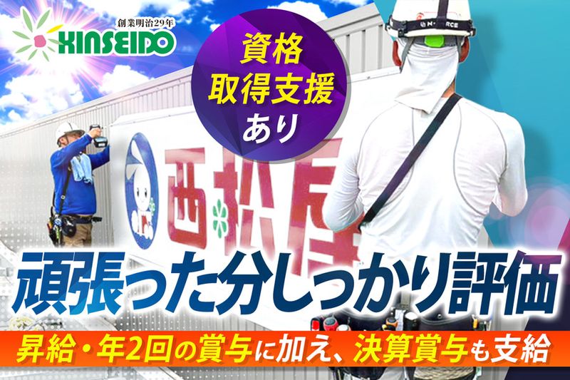 【仕事内容】 業界内でも圧倒的なスケールと実績を誇り、全国規模で数多くの大型案件を手がけている看板製作・施工のプロフェッショナルである当社。 大手企業や行政・商業施設からの厚い信頼をいただき、国内はもちろん、海外からのオーダーにも対応できる体制を整えています。 現在、さらなる事業拡大に向けて増員募集中です。より大きなフィールドを求める、現場監督・施工管理の経験がある方、ぜひご応募ください。 【当社のオススメPoint】 ・目標達成の際には決算賞与を支給! ・年間休日120日以上、年3回の10連休あり ・豊富な資格取得支援制度で管理キャリアを更新 ■具体的な仕事内容 看板の製作・施工において、現場全体の工程や品質、安全を管理するポジションです。職人や協力会社と連携しながら、スムーズな取付工事を進めるための調整業務を担っていただきます。 ・看板製作や取付のスケジュール管理 ・協力会社や職人への作業指示、現場調整 ・現地調査や設置現場での立会い対応 ・社内の製作および設計チームとの連携 ・工事写真や進捗記録などの書類作成 など 【お取引先】 ・銀行や不動産会社などの地元企業 ・総合スーパーや喫茶店チェーン ・家電量販店や家具・インテリア店舗 など 【夏の暑さ対策も万全です!】 どの現場でも安全・快適な作業ができるよう、スタッフ全員に熱中症対策を徹底しています。 ・こまめに水分補給を指示 ・空調ファン付きの作業服を全員に貸与 ・体調不良時はすぐに上司へ連絡する体制 一人ひとりが安心して作業に集中できるよう、会社全体でしっかりフォロー&サポートします! =================== 「ここで働きたい」と思える環境です! =================== しっかり休めて、しっかり稼げる。そんなバランスのいい職場です。 ・年間休日120日、10連休の長期休暇OK ・有給も取りやすいから、プライベートも充実 ・昇給・各種賞与で収入も満足 ・資格取得もサポートあり 収入面も不安なし、成長も後押ししてくれる、そんな環境で働きませんか。 ================= 誇れる仕事を、ふさわしい場所で ================= 積み重ねてきたスキルや経験。それを「活かす」だけでなく、「さらに伸ばせる」環境で働きませんか? 「自分の価値を正当に評価してほしい」 「一歩先を任される仕事に挑戦したい」 「安心して長く働ける会社を選びたい」 そんな想いを抱く方にこそ、あなたの未来を支えるチャンスをご用意しています。 ================ 「確かな技術」が選ばれる理由 ================ 東京・大阪・名古屋・仙台・福岡に拠点を構え、看板施工に特化した全国展開の専門会社――それが私たち金星堂です。 商業施設や公共スペースなど、数百万円〜数千万円規模の多彩なプロジェクトを担当。大手ゼネコンと直接取引を続けてきた実績が、技術と対応力の高さを物語っています。 企画から設計・製作・設置・メンテナンスまで、社内で一貫対応できる体制を整備。現在、さらなる案件増加に伴い、現場監督としてご活躍いただける方を募集しています。 【求人ID-EGY】