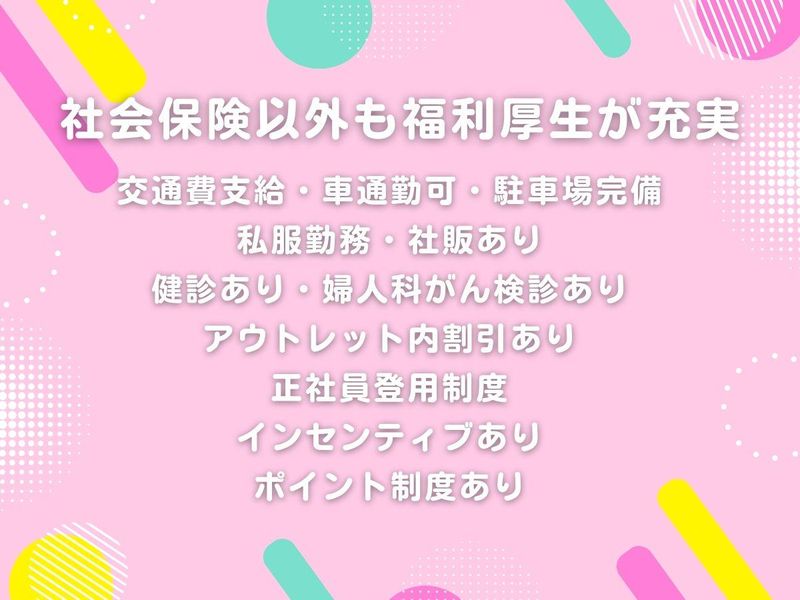 【保険制度】 雇用保険、労災保険、健康保険、厚生年金 待遇・福利厚生 【福利厚生】 交通費支給 車通勤可 駐車場完備 私服勤務 購入強制なし 社販OK 有給あり 健診あり 婦人科がん検診あり アウトレット内割引あり 正社員登用制度 インセンティブあり ポイント制度あり 紹介お礼金 \オリジナルポイント制度/ 勤務1時間で5円が貯まり、 2,000円から商品券に交換できる オリジナルの制度があります! 全国のスタッフさんが利用中です。 \予算・昨対比インセンティブ/ 店長とスタッフ全員が対象の インセンティブ制度が新しく始動! 毎月チャンスがあります。 チームで頑張れるきっかけに♪ (出勤時間に応じて支給します)