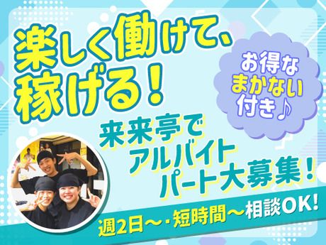 資格 ★未経験者大歓迎!飲食店経験は一切不要 ★経験者の方ももちろん歓迎! ★主婦(主夫)歓迎 ★WワークOK! ★学歴不問 ★扶養内勤務OK ★中高年の方も活躍中! ★ブランクのある方も歓迎 ★アルバイトから正社員を目指したい方も大歓迎 【来来亭の三大原則】 「大きな声での挨拶」 「ニコニコ笑顔で対応」 「キビキビとした行動」 この3つを大切にし、お客様に「また来たい!」と思ってもらえるお店作りを目指しています。 「大きな声や笑顔、キビキビした動きに自信がない…」という方も安心してください。 最初は誰でもできません!先輩がしっかりサポートしますので、安心してスタートできます。 【スタッフの前職例】 コンビニ、カフェ、居酒屋、レストラン、工場、軽作業など、さまざまな前職を持ったスタッフが活躍中! 「家が近い」「ラーメンが好き」「高収入だから」など、動機は何でもOK! 【特別なスキルは一切不要】 ラーメン屋での経験や知識は全く必要ありません。 「稼ぎたい」「飲食店で働いてみたい」など、まずはやってみたいという気持ちがあれば大歓迎!