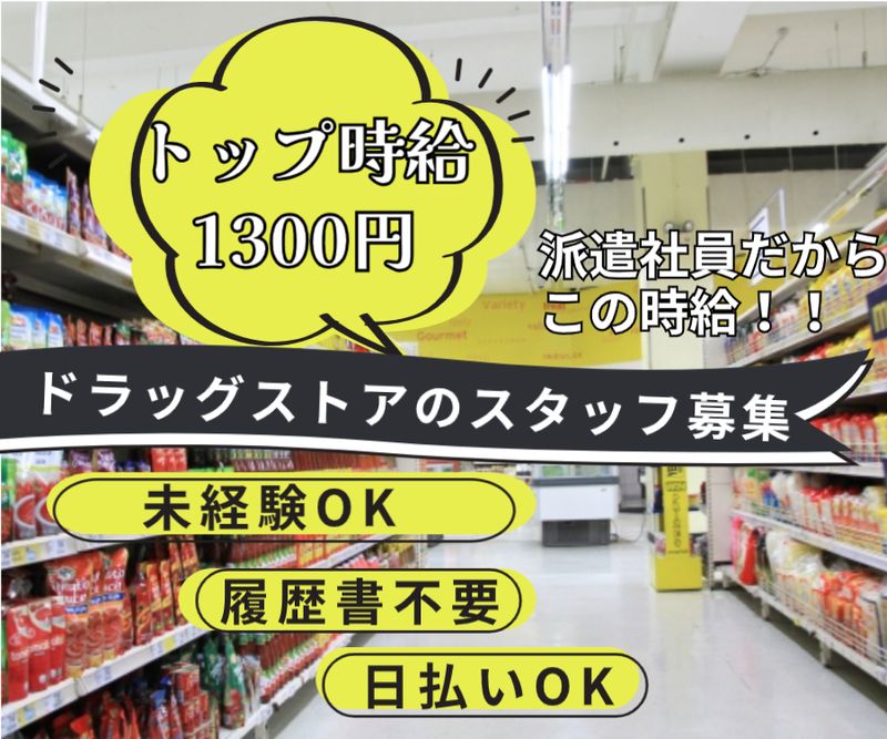 仕事内容 【お仕事point!!】 ・高時給で交通費あり!大手優良企業で長期安定した収入をゲット♪ ・幅広い年代の方が活躍中!弊社スタッフの他店舗で長期で在籍されています! ・同じ業務をされている方や近くに先輩がいるので、心強い!他店舗では弊社スタッフが多数活躍中! ・何でも聞きやすい環境で、職場の雰囲気は良好!自分のペースで仕事を覚えていけますよ♪ - / 女性社員が多く、シフトの融通が利く♪ 年中冷暖房の快適な綺麗な職場環境! \ 【お仕事内容】 \覚えやすい×電話対応なし!/ ・レジ(交代) 「自動釣銭機」で覚えるのはカンタン♪ お金を入れると自動でお釣りが出てくるので安心! ・ご案内・接客対応 ・商品の補充 ・店内の清掃 【研修】 ・OJT(業務をしながら丁寧に教えて下さります) 【就業先・主力商品】 ・医薬品小売業、化粧品小売業 【職場環境】 ・室内禁煙 ・休憩室 ・電子レンジ、冷蔵庫 ・20代、30代、40代、50代の男性、女性活躍中! 【服装】 ・制服貸与 ※通勤時は服装自由! ・シンプルネイルOK! ・髪型・髪色自由(華美でなければOK) (HR-004)