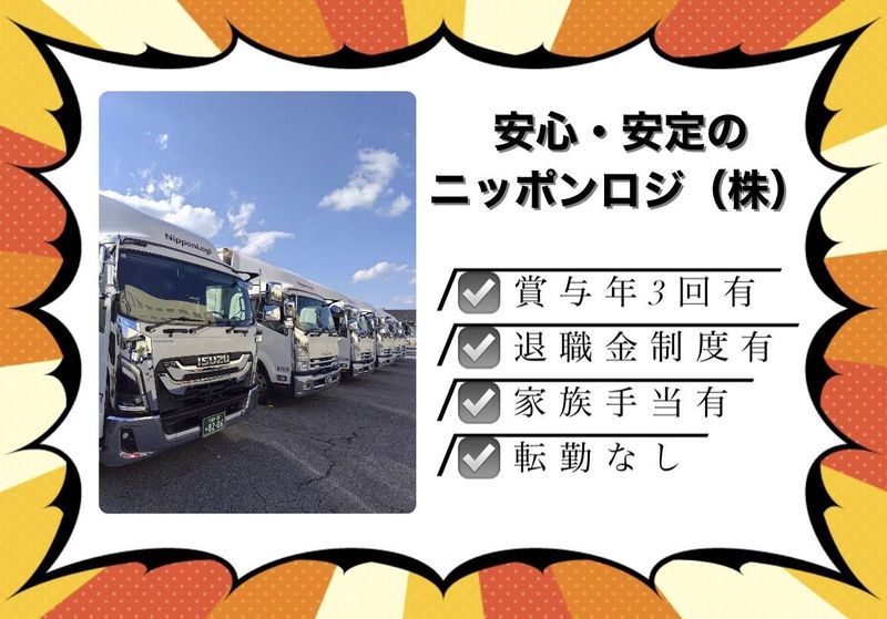 仕事内容 ================= ⭐日勤のみ×長距離なし可⭐ 未経験OKで充実の研修制度で安心スタート◎ ================= ______________ ◆ココが当社のポイント!◆  ̄V ̄ ̄ ̄ ̄ ̄ ̄ ̄ ̄ ̄ ̄ ̄ ̄ ✨ 賞与年3回(7月・12月+業績連動) ✨ 子女教育手当(小学生~高校生)を拡充! ✨ 退職金制度あり ✨ 手当や福利厚生も充実で長期勤務も安心 ✨ 安定基盤で将来も安心! ✨ GWや夏季・年末年始など長期連休有! ________ ■具体的には…  ̄ ̄ ̄ ̄ ̄ ̄ ̄ ̄ ・自社センターからの貸切配送 ・外部荷主様からの定期便/スポット配送 ・フォークリフトを使用した積込み (免許をお持ちの方のみ) 運ぶ商品は常温食品・日用品・雑貨 など生活に身近なもの中心。 安全運転を大切にできる方歓迎です。 ✅ 担当エリアは主に九州管内 (山口~鹿児島) ✅ 長距離希望の方には関東・関西案件 も対応可能です! ✅ 教育体制充実で未経験スタートも安心! ルートや運転のコツなど、2~3ヶ月 かけて丁寧に指導します。 同乗研修でしっかりサポート! ブランクある方も安心◎ ________________ ⭐ニッポンロジ株式会社とは?  ̄V ̄ ̄ ̄ ̄ ̄ ̄ ̄ ̄ ̄ ̄ ̄ ̄ ̄ ̄ 物流システムの高度化・多様化に対応して いく為に、将来を見据え関東・中部・関西、 及び九州地区の14カ所の物流センターを 一つの会社に集約し、「保管・商品管理」 から「輸配送」に至るまで対応可能な、 複合一貫型の統合物流システム企業を 目指しています!