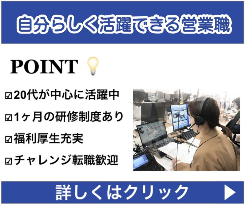 仕事内容 \ 未経験から営業スキルが身につく / ✅ 【未経験の不安ゼロ】 マニュアル完備! ✅ 【キャリアUP】 20代・30代活躍中! ✅ 【タイパ抜群】 週3日の在宅ワーク! ✅ 【働きやすさ】 年休120日&残業極小 ✅ 【研修充実】 3ヶ月の教育担当制度あり! 「オフィスワークにチャレンジしたい」 「自分の市場価値を上げたい」 「人の役に立つ仕事がしたい」 そんな方にぴったりの職場です! 外回りや飛び込み営業は一切なし。 完全内勤&在宅のハイブリッドで、 スマートに働きませんか? ☆★-☆★ まずは問い合わせレベルでもOKです! ぜひ「応募ボタン」より お気軽にご応募ください。 ☆★-☆★ <仕事内容> クライアント企業の代わりに、 電話やオンラインを使って便利なサービスを ご案内する「インサイドセールス」のお仕事です。 外回り営業のように体力を使うことはなく、 室内でデータ入力や商談を行います。 <具体的には> ・電話での商品・サービスのご案内 ・販売促進・キャンペーンの提案 ・会話内容などのデータ入力 ・受託企業への案件引継ぎ ・オンライン商談・契約対応 など 【案件例】 ・WEBマーケティングサービス ・SNS運用代行 ・業務効率化ソフトの導入案内 ・大手求人サービス ・会員制サービスのご案内 ・ビジネスマッチングサービスの紹介 など 半年〜1年単位で 新しい案件に携わることが多く、 常に新しい業界・商材に触れられるため 様々な経験を積み 営業スキルを磨くことができ、 飽きずに長く続けられる仕事です。 経験や希望に応じてスタイルを選択できます。 「もっとスキルアップしたい」 「無理なく働きたい」 そんな希望にも柔軟に対応します! 【入社後の流れ】 入社後は、 ・営業の基礎 ・扱うサービスの知識 ・会話の組み立て方 ・マーケットの見方 などを、マニュアルに沿って 丁寧に学べる研修を実施します。 どのように受け答えをするのか ロープレ研修も実際に行います。 「いきなり現場で覚えて!」 ということは一切ありません。 隣に相談できる先輩も多く、 初めての方でも迷わず進めます 多様な業界を担当するため、 営業力だけでなく 商品知識・マーケティング力など、 幅広いスキルを身につけることができます!