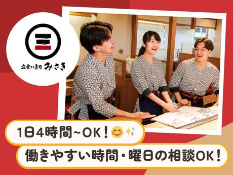 仕事内容 【仕事内容】キッチン中心のお仕事 お寿司を握ったり、軍艦の盛り付けや洗い場、魚の切り付け、その他揚げ物・茶碗蒸し・みそ汁といったサイドメニュー作りもお任せします。最初から複数のポジションをお願いするわけではなく、1つ1つ作業を覚えていけばOKです。もちろん丁寧にお教えしますので、調理未経験の方も安心してください。お寿司職人を目指す方も歓迎。※店舗の状況によっては、ホール業務をお任せする場合もあります <ブランクOK!元立食い寿司みさきスタッフを積極採用中> 立食い寿司みさきでは大勢の元スタッフが職場復帰しています。 以前に勤務されていた時と比べて 「新しいシステムが入っていたら、ついていけるかな?」 「仕事のやり方、大きく変わっていたらどうしよう。また一から覚えるのは大変そう…」 「辞めてからブランクがあるけど、すぐに勘は戻るかな?」 などの心配もあるかもしれませんが、もちろんイチから始めていきますので 安心して応募くださいね。 新しいマニュアルもばっちりなので、少し働けばすぐに勘も戻るはず♪ 職場復帰しやすい環境です 「大学受験の時に忙しくて退職しちゃったけど、大学生活にも慣れたし、もう一度立食い寿司みさきに戻りたいな」 「子育ても少し落ち着いてきたし、合間の時間でまた働きたいな」 など、もう一度立食い寿司みさきで働きたいと思っていただける皆さんを大募集! 自由度の高いシフトで、今の生活環境に合わせた働き方がきっと見つかりますよ。 「当初と同じ店舗で」「新しい店舗で」はじめてみませんか!? 【ココが嬉しい】お得な食事補助あり 勤務日には「お店のメニューが半額」「日替わりのまかない丼が1品308円」のどちらかを選べる食事補助あり!鉄板メニューから贅沢なメニューまで、お得な補助制度を活かしてぜひ勤務日の楽しみのひとつにしてください! 【私たちについて】赤シャリが自慢の回転寿司 職人が握る本格的な「赤シャリ」の寿司をリーズナブルな値段でご提供する立食い寿司です。特別に熟成させた赤酢を使用しており、まろやかな味わいが特徴。また、豊富に取り揃えたネタをすべて一貫から楽しめる人気店舗です。 【私服OK】お気軽に面接へお越しください♪ ・面接時履歴書の持参不要 ・年齢、経験、もちろん不問!応募者全員面接中! ・お友達と一緒に応募OK(面接は、店舗によっては別になる可能性もあり) ・もちろん面接は私服でOK ■応募後の流れ↓ まずは「応募する」ボタンより気軽にご応募ください! ご応募後は応募受付センターよりメールにてご連絡いたします。 希望面接日の設定をお願いします★ ■面接当日の流れ↓ (1)応募した店舗までお越しください。スタッフがご案内します! (2)タブレットをお渡ししますので、希望の働き方や必要事項などの入力をお願いします。 (3)入力が終われば担当者が参ります。難しい質問はありませんので安心ください。 (4)長くても30分程で終了♪採用の場合に限り、7日以内に店舗よりご連絡いたします! ※不採用の場合は連絡いたしません。ご了承ください。 皆さんと一緒に働ける日を楽しみにしています! もしもわからないことや、確認したいことがあれば応募受付センター(0570-006-628)までお気軽にご連絡ください。 ※【電話受付】10:00~19:00