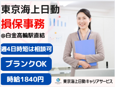 仕事の内容 \ご指示しっかり!損保ブランク歓迎/ ◆照会電話は慣れてからで大丈夫です ◆残業なし!週4日や時短(10~16時)ご相談下さい♪ @白金高輪駅直結 【基本情報】 雇用形態:派遣社員 雇用期間:長期(3カ月以上) 26年1月~開始日相談可能 就業時間:9:15~17:00(休憩60分) 【必須条件】 ◆損保事務のご経験がある方 ◆パソコン:基本操作(入力~修正) 【お仕事内容】 ・契約書類チェック ・不備確認&修正 ・帳票や書類の仕分け… ※種目:自動車(9割)、火災保険(1割) ◆東京海上日動の<専用システム>初めての方は研修あり! ↓ ◆マニュアルや検索データベース…分からないことはサクッと検索OK ◆業務の進捗も共有できるので、 誰かがお休みの時もスムーズにフォローし合えて便利です◎ 【環境面等】 @白金高輪駅直結/最寄り駅から徒歩1分 ・20代、30代、40代、50代がご活躍中 ・社員さんのフォローが行き届いた職場 ・オフィスカジュアル内で服装自由 ・お弁当持参OKです └ビル内にコンビニあり 【福利厚生等】 ・社会保険完備 ・禁煙オフィス!煙苦手な方も安心 ・平日のみOK!土日祝休み ・年間休日120日以上&お休み相談可 └有給休暇 ○●応募検討中の方へ●○ 勤務日数も時間も調整できるから、家庭やプライベートとの両立も◎ご経験を活かして、もう一度“自分らしい働き方”を始めてみませんか?少しでも気になった方は、ぜひお気軽にご応募ください♪ ○●嬉しいPOINTたくさん!●○ 履歴書不要!即日勤務OK・開始日相談できます/長期/駅チカ/駅歩5分以内/主婦・主夫活躍中/子育てに理解のある職場/ブランクOK/研修あり/社保完備/残業なし/17時退社/7時間以内勤務@時給1840円/週4日以上OK!10~16時の短時間勤務も応相談