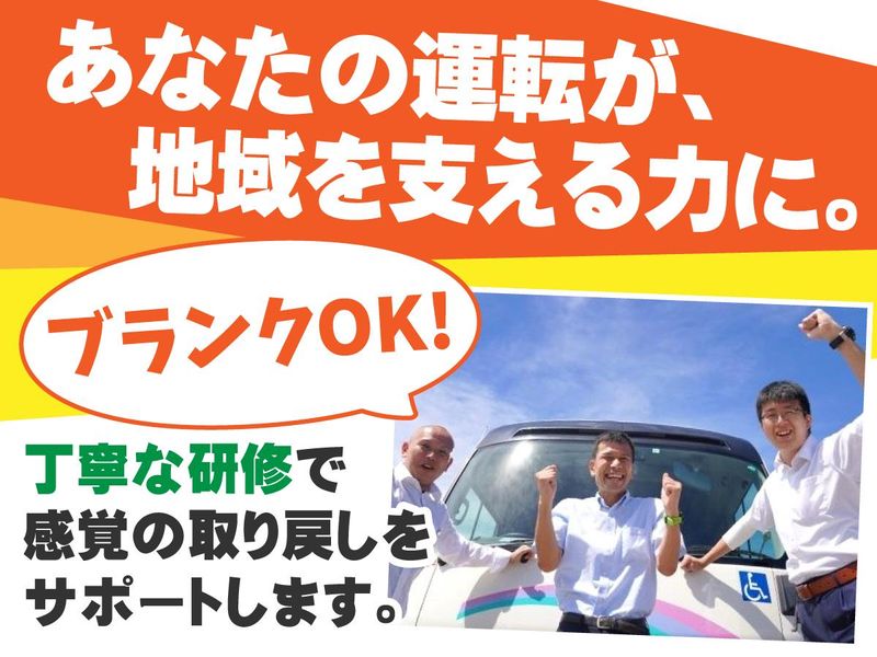 職場環境 40代50代のミドルパートのドライバーが活躍中です。 教育体制を整えているので、福祉業界の知識や経験がなくても問題ありません。 福祉送迎特有のリフト操作方法や送迎時のマナーなども全てお教えします。 丁寧な研修でしっかりサポートします。 喫煙所:なし(敷地内全て禁煙)