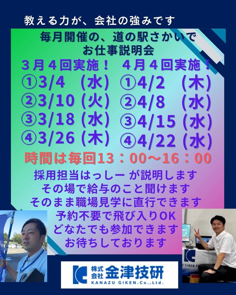 アピールポイント: ★金津技研の準社員が選ばれる理由 ・固定給なので、生活が安定する ・固定給なので、色々な支払いの目途が立てられる ・賞与があるのが嬉しい ・安心して仕事に取り組める! ★福井県の企業ではNo.1の人数規模で製造請負事業をおこなっている会社です。 ★教える力が、会社の強みです。 ★仕事の教え方研修TWI-JIを受けた社員たちがいます。 ★新人を放っておかない文化があります ★わからないを、放置しない ★正社員の離職率1%という低さが自慢の働きやすい会社です ★当社はみんなの和を乱す人でなければ即採用します - -