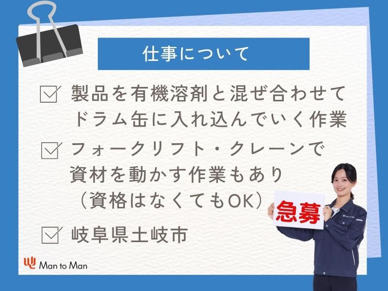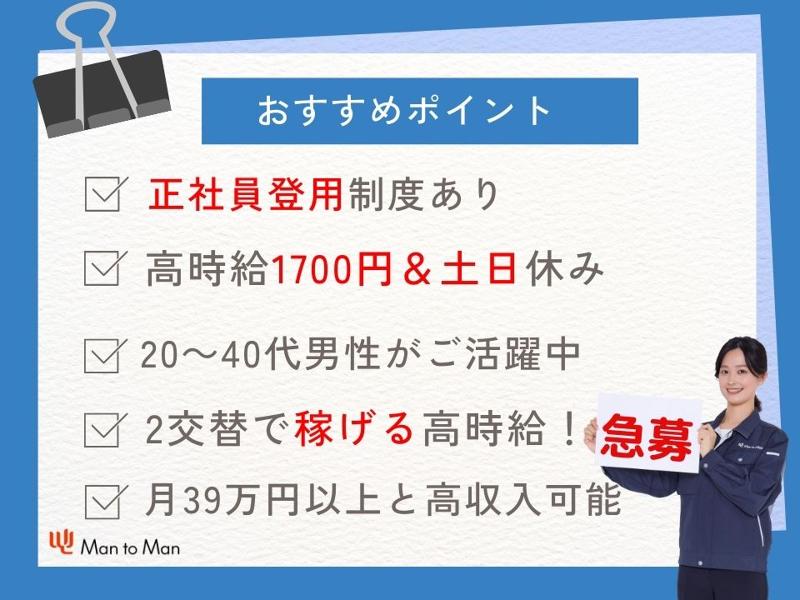 求める人材: 【応募資格】 未経験OK/ブランクOK 特別な知識・スキルは一切不要です。 未経験からスタートした方が半数以上 ーーーーーーーーーーーーーーーーーー Man to Manでは以下の様な スタッフさんが活躍されています。 ・正社員を目指している方 ・派遣社員としてスキルを磨きたい方 ・工場でのお仕事に興味がある方 ・製造業にチャレンジしたい方 ・フォークリフトの資格を活かしたい方 ・男性活躍中の職場で働きたい方 ・20代、30代、40代活躍中の職場で働きたい方 ・車で通勤したい方 ・とにかく稼ぎたい方 ・プライベートを充実させたい方 ・年間休日120日以上の職場で働きたい方 ーーーーーーーーーーーーーーーーーーー Man to Manには、 ハローワークや一般求人誌には 掲載されていないお仕事情報も たくさんありますので、 まずはお気軽にお問合せください。