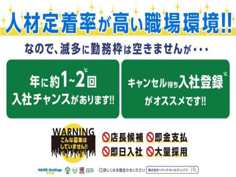選考プロセス 【選考の流れ】 ●応募フォームよりご応募 ↓ ●面接可否を、電話もしくはメールにてお知らせ致します。 ↓ ●担当者と面接 ↓ ●採用決定 ↓ ◎入社 ※選考の流れが変更となる場合もございますので、ご了承ください。 【面接地】 各店舗にて 【会社概要】 株式会社ヘアーズ・ホールディングス 〒448-0047 愛知県刈谷市高津波町3丁目508番地 https://hairs-hd.com/