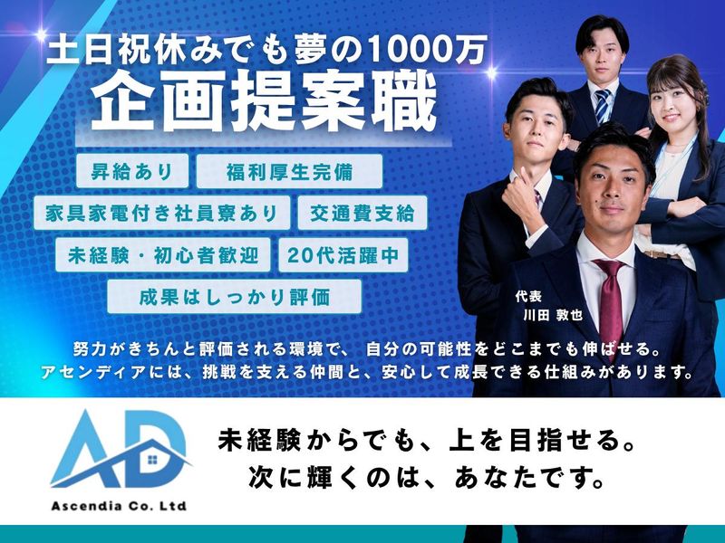 月給300,000円~500,000円 給与詳細 基本給:月給 30万円 〜 50万円 固定残業代:なし 【一律手当】 全員に一律で支払われる通勤・皆勤・家族手当金額:なし 全員に一律で支払われるその他手当金額:なし 昇給:年1回【※2024年直近平均年収100万円以上UP多数】 業界未経験でもメンター制度と研修制度が充実しているので年収1000万円も実現可能‼ 【給与例】 給与例 【月収例】 ・月収:30万円+歩合20万円➝50万円(入社2年目、25歳) ・月収:30万円+歩合80万円➝110万円(入社3カ月目、19歳) ・月収:30万円+歩合50万円➝80万円(入社1年目、22歳) 【年収例】 ・年収600万:固定給30万+歩合給 (入社6か月、19歳) ・年収960万:固定給30万+歩合給 (入社1年目、22歳)
