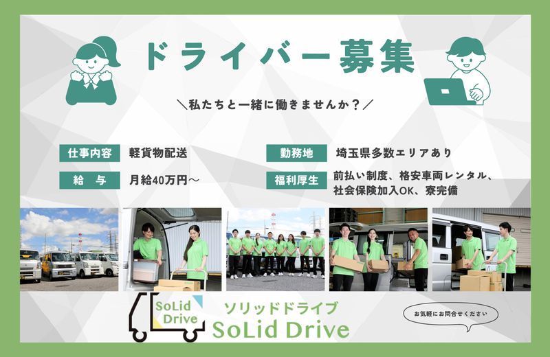 仕事内容 ▼▼ 医薬品を届ける配送ドライバー ▼▼ 医療機関や調剤薬局へ医薬品をお届けする、 社会に必要とされる配送業務です。 生活に欠かせない分野のため 仕事量も常に安定しています◎ 【 お仕事内容 】 常温ワンボックスカーで、 医薬品を1日30~40件ほど配送します。 AM・PMの2便に分かれており、 決まった流れで配達もスムーズ◎ 【 具体的には… 】 ◆医薬品の積み込み(軽量物中心) ◆医療機関・薬局へのルート配送 ◆荷物のお渡し・受領 ・積み地:東京都目黒区(学芸大駅付近) ・配送先:主に都内とその周辺 ・1日30~40件程度/AM・PMの2便制 ・高速使用指示があった場合は実費お支払い ◤ 決まった時間帯で働きやすい! ◢ ✅基本は7:30~16:30(7:00~16:00) ✅土日祝休み(月1回のみ土曜出勤あり) └ 6h勤務:日給11,000円 ✅超過した場合は30分ごとに750円支給 毎日ほぼ同じ時間帯のため、 生活リズムが整いやすく、 無理なく続けられる環境です◎ プライベートとの両立も応援します! ◤ 研修1ヶ月で安心スタート! ◢ 初めての方でも安心できるよう、 約1ヶ月間は先方スタッフが 横乗りしながら丁寧にレクチャーします! 配送ルート・納品方法だけでなく、 医薬品ならではの注意点など、 現場で実践しながら習得できます◎ ◤ サポート体制もバッチリ! ◢ ✅車両レンタル制度あり ✅ガソリン・ETCカード貸し出し ✅日払い・週払い制度あり(規定あり) 貨物軽自動車運送業を行う会社です。 若者が自分の仕事に誇りを持てるよう、 会社として共に成長を目指しています。 【公式HP】https://soliddrive.jp/ 実際に働くスタッフの声も多数掲載中!