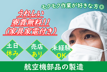 仕事内容 【寮費無料!】【駅チカ!】モクモク作業が好きな方におすすめ!やりがいのあるお仕事してみませんか?充実の研修制度があるので未経験でも安心◎ <仕事内容> 航空機部品を製造している工場での作業になります♪ 研修もあり、未経験でも問題ございません◎ 〇組立 ・穴あけ作業(エアドリル使用) ・組み立て後部品チェック 〇板金 ・機体ボディ部分のアルミ製部品をハンマーなどの各種工具を使い曲面を作っていく作業。 〇塗装 ・航空機に使われる部品を製品に合わせた色に塗装する作業。 手の平サイズの部品に対してスプレーガンを用いて吹付塗装を行います。 〇加工 ・小物エンジン部品の加工オペレーター 飛行機のジェットエンジン部品(手のひらサイズ)の加工オペレーターです。 マシンに部品をセットし、ボタンを押すだけのカンタン作業。 ※作業内容を選べます! 作業内容・部署によっては交替勤務になる場合がございます。 ライン作業となります。 立ち作業でのお仕事です。 クリーンルーム内作業となります。 個人作業・グループ作業どちらもございます。 《職場環境》 男性が多い職場です。 冷暖房完備です。 ロッカー有り|休憩室完備|売店有り アピールポイント <仕事内容> 航空機部品を製造している工場での作業になります♪ 研修もあり、未経験でも問題ございません◎ 〇組立 ・穴あけ作業(エアドリル使用) ・組み立て後部品チェック 〇板金 ・機体ボディ部分のアルミ製部品をハンマーなどの各種工具を使い曲面を作っていく作業。 〇塗装 ・航空機に使われる部品を製品に合わせた色に塗装する作業。 手の平サイズの部品に対してスプレーガンを用いて吹付塗装を行います。 〇加工 ・小物エンジン部品の加工オペレーター 飛行機のジェットエンジン部品(手のひらサイズ)の加工オペレーターです。 マシンに部品をセットし、ボタンを押すだけのカンタン作業。 ※作業内容を選べます! 作業内容・部署によっては交替勤務になる場合がございます。 ライン作業となります。 立ち作業でのお仕事です。 クリーンルーム内作業となります。 個人作業・グループ作業どちらもございます。 《職場環境》 男性が多い職場です。 冷暖房完備です。 ロッカー有り|休憩室完備|売店有り \充実した福利厚生/ ◎社会保険・雇用保険完備 ◎有給休暇有(6ヶ月経過後、10日付与)※規定あり ◎残業手当 ◎交通費支給(規定内) ◎確定拠出年金制度 ◎週払い制度(週3回対応) ◎お友達推薦制度あり(規定有り) ※1名につき3万円~10万円臨時給与として支給 ◎バイク通勤・自転車通勤可(無料駐輪場あり) ◎寮完備(寮費無料・家具家電付き) ◎制服貸与 ◎冷暖房完備 ◎社員食堂あり ◎食事持参可 ◎ロッカー・休憩室利用可 ◎売店あり ◎福利厚生プログラム (宿泊、グルメ、ショッピングなど大幅割引が受けられる10万アイテムのメニューがあります。)