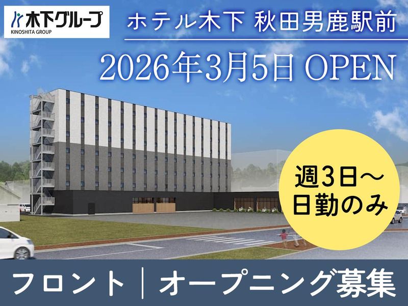 仕事内容 ◆◆おすすめポイント◆◆ ✅2026年 3月5日にオープン予定! ✅ピカピカの館内、最新設備のホテル ✅日勤のみ&週3日~勤務OK! ✅木下グループという安定基盤 ✅フロントデビューしたい方も歓迎! ━━━━━━━━━━━━━━━━━ 【仕事内容】 木下グループの新規事業第1号店! 2026年 3月5日にオープン予定の 「ホテル木下 秋田男鹿駅前」にて 日勤フロント業務をお任せします。 <具体的には> ■チェックイン/チェックアウト対応 ■お客さまからのお問い合せ対応 ■予約の管理 ■売上の管理 ■メールでのお問い合わせ対応 ■アメニティなど各種在庫管理および発注 ■プランの作成やSNS/メルマガなどの販促業務 ■清掃・レストランスタッフのサポート ※2026年1月〜2月頃より勤務開始予定です。 ━━━━━━━━━━━━━━━━━ 【ホテル木下について】 住宅・不動産・医療・福祉・ スポーツ・エンターテイメントなど 様々な事業を展開する木下グループが 2026年新たにスタートする事業───。 それが、「ホテル木下」です。 その第一号店として、 2026年3月5日にオープンするのが 「ホテル木下 秋田男鹿駅前」。 館内には男女別大浴場やそれぞれ 高温・低温の2種のサウナを完備。 男鹿の自然や海をモチーフにした 客室デザインや、快適に過ごせる 機能的な設備など、木下グループの 長年のノウハウを凝縮したホテルです。 今後も国内において順次、 ホテル事業を展開していく予定です。 ━━━━━━━━━━━━━━━━━ 【地域の魅力を伝える“観光案内役”に!】 多くの観光客が訪れる「男鹿」の玄関口で、 地域の魅力を伝える“観光案内役”として 働くやりがいがあります! オープン前に接客やシステム操作なども 基礎から学べるので、「初めての ホテル業界デビュー」という方も ぜひご応募お待ちしております! みんな一緒にスタートするので、 同期の仲間もできますよ◎ ピカピカの館内、最新設備のホテルで、 立ち上げメンバーとして、お客様を迎える “最初の笑顔”になりませんか? ━━━━━━━━━━━━━━━━━ 【ライフスタイルに合わせて働ける】 フロント業務では珍しい「日勤限定」。 夜勤なしで週3日〜OKなので、 家庭・学業・プライベートと 両立しやすいのが魅力です。 主婦(夫)さん・フリーターさん・ 学生さん・Wワーク希望の方まで 幅広く歓迎いたします。