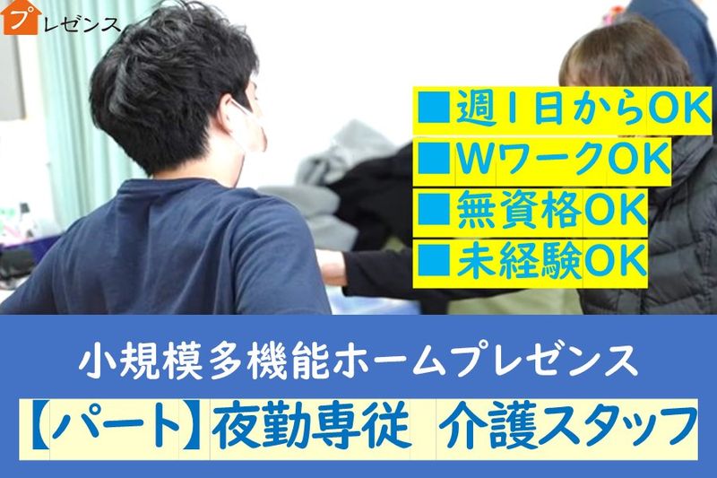 【仕事内容】 無資格・未経験の方もOK! 週1日からOK!介護パートスタッフ募集! 小規模多機能ホームプレゼンスでは、人と人の繋がりを大切にして、「必要とされる存在」という喜びを実感できる施設を目指しています。 株式会社PRESENCEは、横浜市発の「みんなにやさいしい介護のプロを目指す」プロジェクト2018、2019年に受賞された認定事業所です。 ◎小規模多機能型居宅介護とは ご利用者様が自立した生活を送ることができるよう、通所介護(デイサービス)・訪問介護(ホームヘルプ)・短期入所生活介護(ショートステイ)を組み合わせながら利用できるサービスです。 登録定員29名/通所15名・泊り5名になります。 ★体験入社可能です! ・面接後、希望者は1日(半日もOK)体験入社可能です。 ※お給与・交通費ともに支給致します。 【具体的な仕事内容】 夜勤は3~4名体制!インカムを装着し当日の夜勤者と連絡を取りながら勤務出来るので緊急時などスムーズに対応できます。 また、見守りシステムが入ってる為、巡視の回数は少なめです。 ・身体介護(見守り、移動介助) ・排泄介助 ・食事(配膳、下膳、見守り、食事介助) ・夜間帯のご利用者様の見守り ・業務記録 ・起床時の介助 など ※無資格・未経験の方の場合、まずは日勤帯で研修と業務に慣れていただいてから夜勤業務についていただきます。 ●小規模多機能ホームプレゼンスの魅力 若い世代が活躍しやすい環境! 30代以下を中心に幅広い年代層の職員がいるので、同年代での意見交換はもちろん困った時はベテランの職員に相談することも出来ます。 ●業務効率ツールで手書きの手間を削減 業務上の入力作業はiPadを使用して手書き作業の負担を軽減しています。 ●駐車場無料 マイカー通勤・バイク通勤が可能で、駐車場も無料でご利用いただけます。 ●資格取得支援・独立支援あり 介護初任者研修、介護福祉士、ケアマネジャーなどの資格取得や、起業や独立を目標にしている方を支援します。 ●職員の生活を支援します 子育て中の方への支援をはじめ、生命保険や不動産、相続関係、親族の方の介護など、職員のサポートをしています。 ぜひご応募くださいね。 いきなりの面接は不安な方には施設見学も大歓迎です。 働き方の相談や、仕事内容のご質問などのお問合せもお気軽にご連絡ください。 【求人ID-P01】