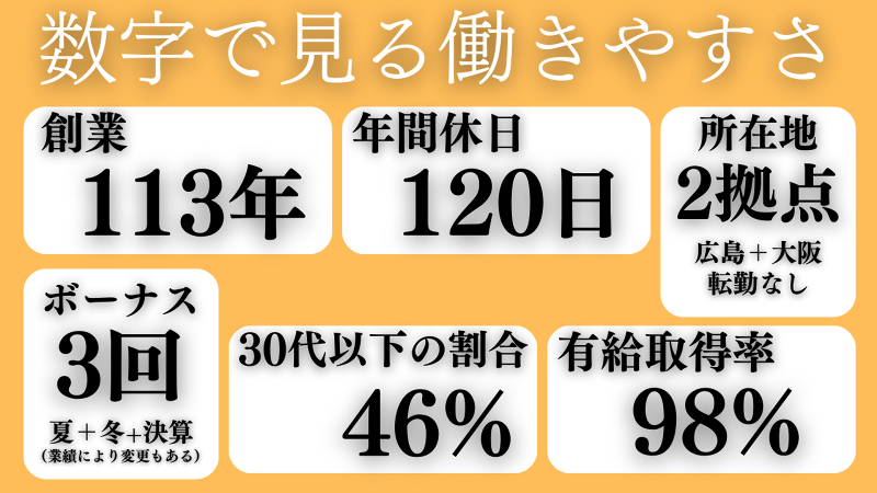 【保険制度】 雇用保険、労災保険、健康保険、厚生年金 待遇・福利厚生: ①取りやすい有給休暇 一人あたり10日~20日/年の有給が与えられます 前日までに申請/勤怠ワークフローで上長に申請 ②5万円~10万円の旅行券プレゼント 勤続5年満了ごとに支給 5年目:カタログギフト 10~15年:5万円分の旅行費 20年以上:10万円分の旅行費 ③子育て世帯への支援(小学校3年生まで) 時差出勤制度・時短勤務制度を導入 子育てのための時間をしっかり確保いただけます